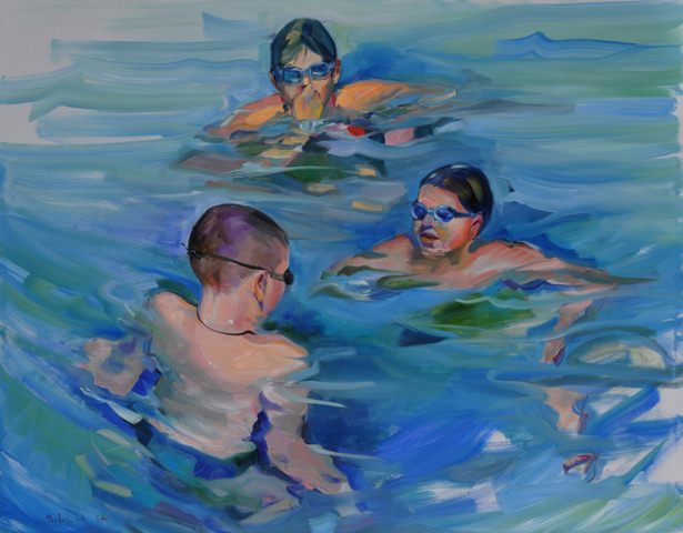 Siamo così al passo decisivo, a ciò che definisce la maturità concettuale di Malacarne. Perché l’acqua senza umanità resterebbe un serbatoio fertile ma non riproduttivo, come se mancasse l’equazione di chiusura del cerchio. Serviva lo scatto umano, una presenza che fosse energia. E allora ecco aprirsi le danze acquatiche: ragazzine e ragazzini che nuotano o galleggiano da fermi, soli o in piccoli gruppi, osservati dalla giusta distanza, con pudore genitoriale ed equilibrio prospettico. Bravo l’artista nel fermarsi dove serve, mai sul campo panoramico che disperde il fattore emotivo, mai sul dettaglio che comporta responsabilità ulteriori. L’inquadratura afferra l’emozione e ce la rimanda con adeguata sintesi, evitando fronzoli in eccesso o smanie da voyeur. Il nostro mantovano ha un approccio morbido, quasi impressionista nei passaggi del colore; respiri un’affezione che esercita un climax ma non drammatizza l’atmosfera. Senti che scorre benessere, le tensioni si disperdono, la gioia emerge ma non sovrasta la natura mentale del progetto. Non percepisci alcuna finzione o posa costruita, l’occhio pittorico sembra una cinepresa che osserva senza enfasi, proteggendo i protagonisti del racconto. Amore e benevolenza si fondono nella radice degli obiettivi e nella germinazione dei risultati: Malacarne dipinge con empatia, metabolizzando le atmosfere estive, i sentori climatici, rendendo quasi tattile la sua narrazione mediterranea. La pittura profuma di bouganvillea e sale marino, crema solare e pini marittimi, cotone e anguria… ciò che non si vede esiste ma solo se l’occhio ama l’icona, se la visione invade le emozioni, se l’immagine contiene la valenza dell’immaginario.