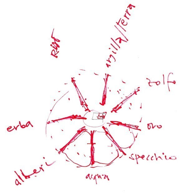 Otto vie immaginarie pensate come un omaggio alla città di Milano, il ricordo della visione utopica del FILARETE. Otto gli elementi installativi: erba, alberi, acqua, specchio, foglia d’oro, zolfo, terra, riso. Elementi primari che si trovano in natura,