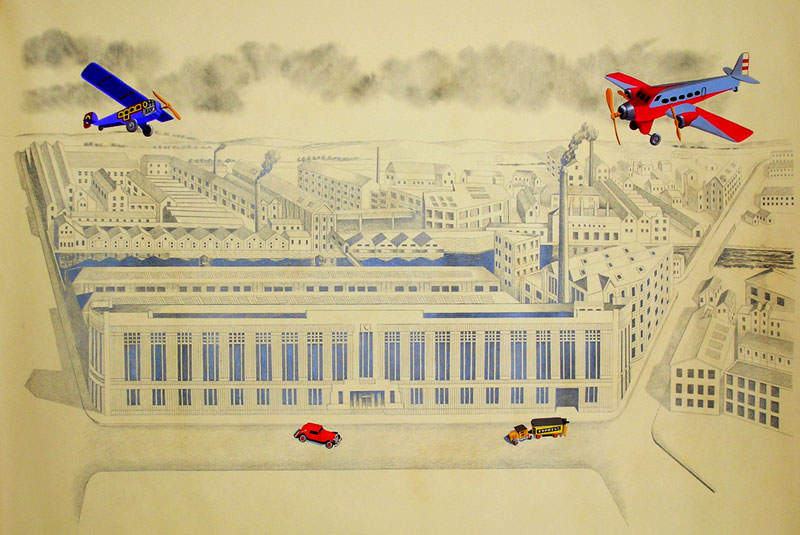 Mostly are sights from above, overviews that allow to seize the architectural structure as a whole, a background that was, in the early paintings, nearly always monochrome and unreal, emphasizing the realism and the solid three-dimensionality of toys that walk the streets or sail the skies.