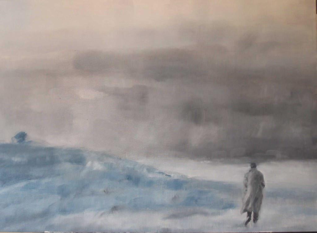 Con digressioni panteistiche in un mondo spaventevole e monocromatico il pittore compie un passo successivo quanto necessario, nella presa di coscienza del sé, rispetto all’uomo ottocentesco immergendosi nelle nebbie, lasciandosi permeare da un mondo in disfacimento, allo stato liquido e gassoso e apparentemente privo di confini certi, desolatamente illimitato e non finito; simile a un viandante inquieto e curioso, defilato rispetto alla centralità del quadro nel quale trova invece saldamente posto la Natura, moderna madre matrigna e portatrice di pensieri nefasti, il pittore ci concede fugaci apparizioni di spalle, prima di sparire triste e solo nel cammino che il destino sembra avergli indicato, lungo il viaggio esistenziale la cui fine appare ancora lontana.