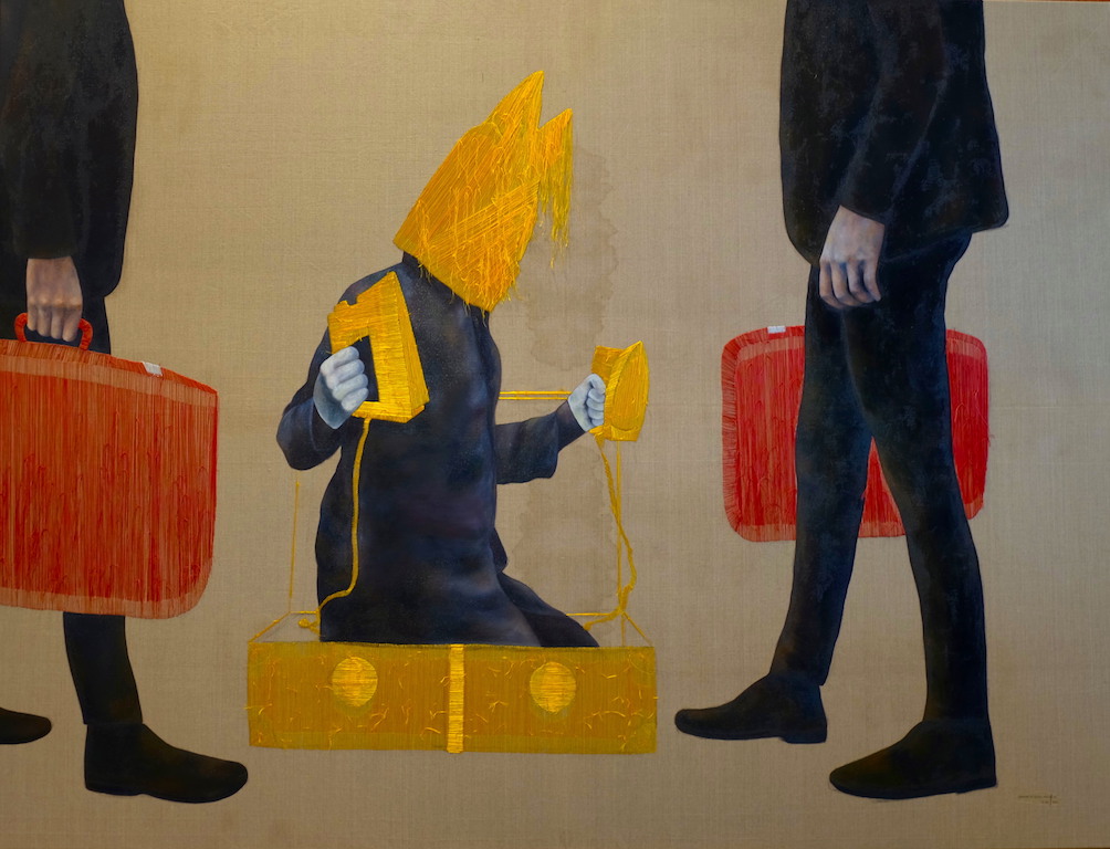 Ma veniamo ai quadri. Sono dipinti su grandi tele, non preparate, trovate da qualche parte con delle macchie semitrasparenti, che sono state lasciate intenzionalmente in evidenza. All’interno di questi spazi bidimensionali vediamo in grandezza più o meno reale, dei personaggi tutti vestiti di nero e con il volto coperto (per essere precisi sempre la stessa figura ripresa in vari atteggiamenti) che appaiono in certi lavori sdoppiati attraverso delle vuote silhouette lineari in posture diverse, in modo da suggerire un doppio movimento. Questi individui compiono delle strane azioni in rapporto a degli oggetti. Uno sta piegandosi prendere una valigia rossa da terra. Un altro ha la stessa valigia in mano, mentre il suo doppio “lineare” ne porta una uguale tra le braccia. Un altro ancora, sta in piedi sulla valigia con il volto coperto da una sorta di bizzarro cappuccio giallo con le orecchie. Lo stesso tipo incappucciato ritorna in tele differenti. In una scena lo vediamo di spalle in cammino con in mano una macchina da cucire gialla, mentre in una composizione più articolata lo troviamo (in mezzo a due figuri di cui compaiono solo le gambe) inginocchiato su una valigia gialla con nelle mani due ferri da stiro sempre gialli. Il significato di questi oggetti, simbolico o meno, è decisamente criptico ma stranamente suggestivo.