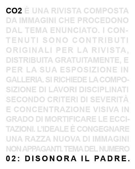 CO2 è una rivista composta di immagini giustificate da un tema dato. I suoi contenuti sono contributi originali configurati per la rivista e nel formato della rivista, che è a distribuzione gratuita. Essi, a ogni uscita, vengono messi in mostra ed esposti alle pareti della galleria.
