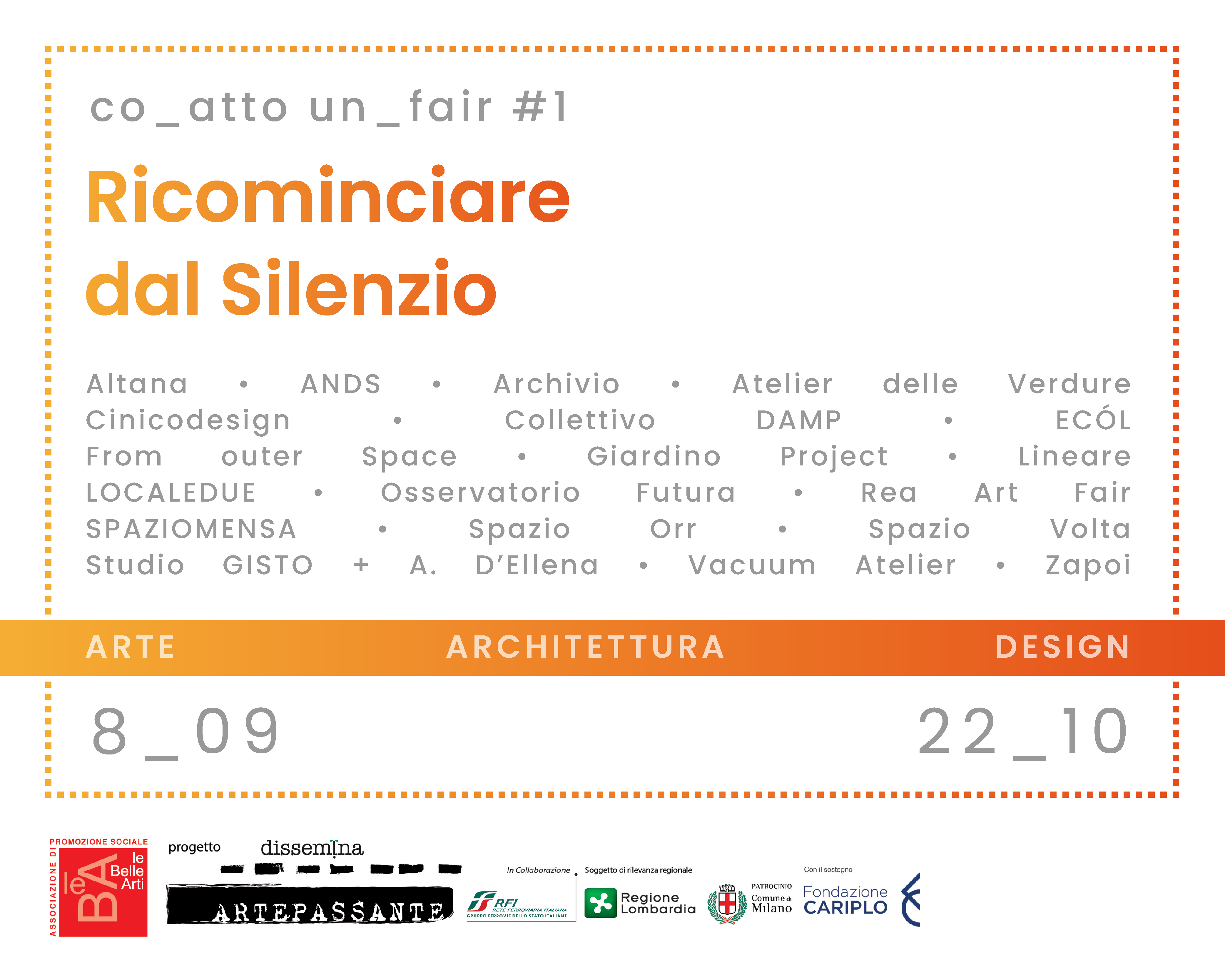 Mercoledì 8 settembre 2021 dalle ore 18.00 alle ore 21.00 inaugura co_atto un_fair #1 “Ricominciare dal silenzio”. co_atto un_fair è il festival in vetrina a cadenza annuale organizzato da co_atto in concomitanza con DesignWeek e ArtWeek.