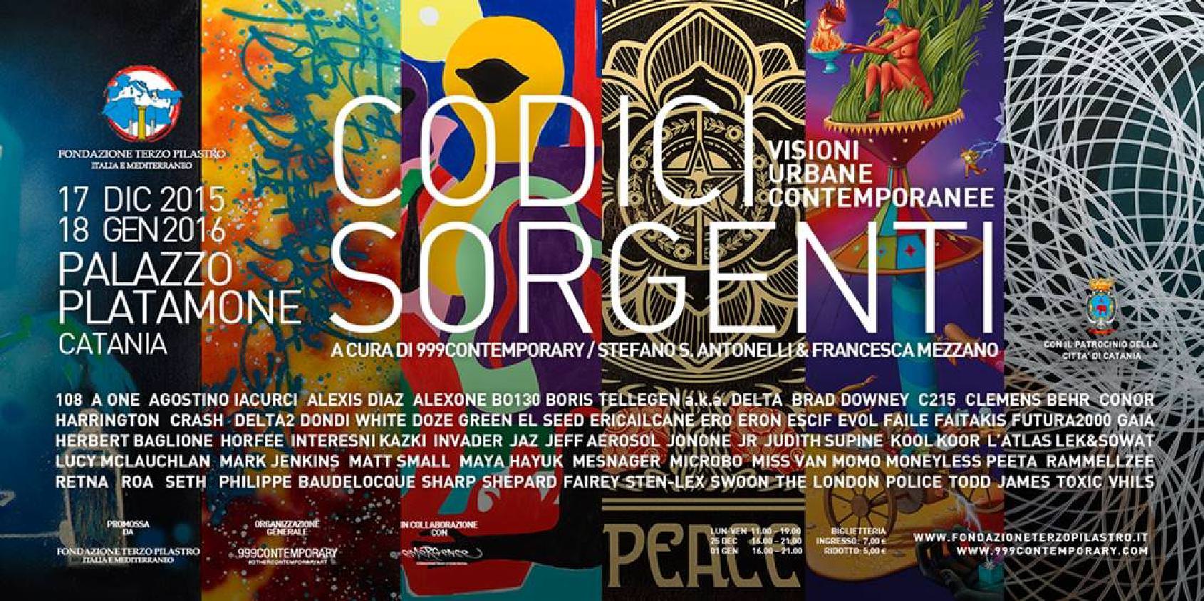 Divisa in tre sezioni che raccontano la nascita, sviluppo interattivo e consacrazione del fenomeno, CODICI SORGENTI mostra per la prima volta insieme le opere di artisti iconici della contemporaneità: 108, A One, Agostino Iacurci, Alexis Diaz, Alexone, Bo 130, Boris Tellegen (a.k.a. Delta), Brad Downey, C215, Clemens Behr, Conor Harrington, Crash, Delta 2, Dondi White, Doze Green, El Seed, Ericailcane, Eron, Escif, Evol, Faile, Feitakis, Gaia, Herbert Baglione, Horfee, Inetresni Kazki, Invader, Jaz, Jeff Aerosol, Jenkins, Jonone, JR, Judith Supine, Kool Poor, L’Atlas, Lek&Sowat, Lucy Mclauchlan, Matt Small, Maya Hayuk, Mensanger, Miss Van, Momo, Moneyless, Peeta, Rammellzee, Retna, Roa, Seth, Philippe Baudelocque, Sharp, Shepard Fairey, Sten-Lex, Swoon, The London Police, Todd James, Toxic Vhils. Le opere, provenienti dalle più importanti collezioni private internazionali, costituiscono un’unicum nel panorama espositivo attuale che diviene insegnamento e monito: «In un mondo che s’uniforma ogni giorno di più»