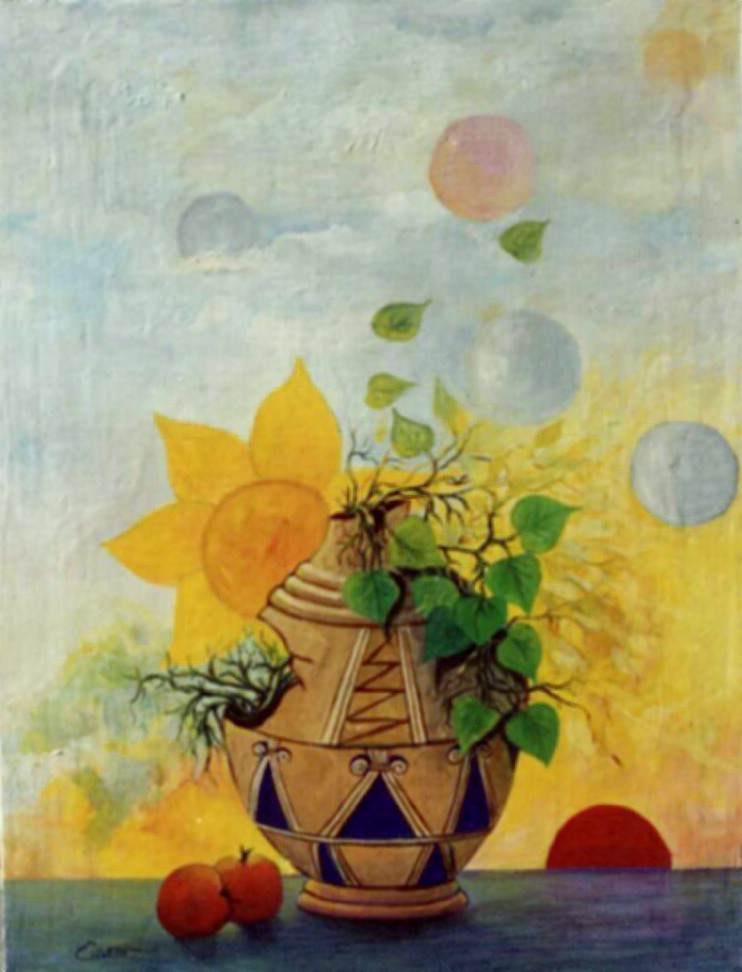 Diverso è il linguaggio di Carlo Silvetti che su fondali suggestivi, staglia brandelli di muri, dalle difficili angolazioni, o alterna elementi fantastici con altri in nature morte composite, conferendo alla scena un senso di pacata malinconia, sottolineato da uno spazio solitario, dove la presenza umana è solo intuita o meglio suggerita. Una presenza-assenza fortemente connotata da un fiore giallo che il Silvetti inserisce, con modalità diverse nei suoi quadri, come un logo, per meglio definire il carattere metafisico della sua pittura. Non a caso le sue peculiarità sono riconducibili alle prospettive distorte, alle luci innaturali, agli oggetti quotidiani inseriti in contesti improbabili, il tutto per dar vita a magiche atmosfere, cariche di violenze che rimandano a significati più ampi.