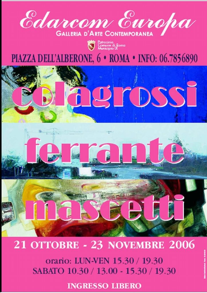 Dal 21 ottobre al 23 novembre 2006 la galleria d’arte contemporanea Edarcom Europa ospiterà, presso la sede di Piazza dell’Alberone, 6 a Roma, una mostra dedicata a tre artisti tra i più apprezzati sulla scena romana e nazionale, Angelo Colagrossi, Mario Ferrante e Piero Mascetti.