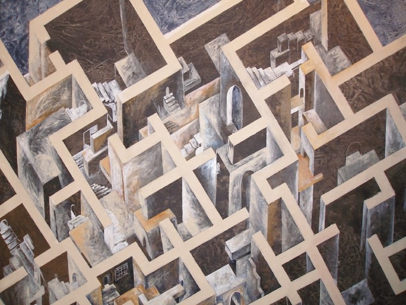 Che il labirinto rappresenti di per sé, da sempre, arte, architettura, politica, tirannide, psicologia, sociologia, mostruosità e mitologia è evidente, e non v’è alcun bisogno di spiegarlo. A cos’è che faccia poi riferimento cotanta intensità emotiva e mentale, di volta in volta, non è altrettanto ovvio. Da sempre, dal leggendario Cnosso che, da una parte, sembra sia stato fatto costruire per motivi umani - per gelosia - e, dall’altra, per motivi politici - quale simbolo della sottomissione di Atene a Creta - c’era, da una parte, il Minotauro a rappresentare l’atavica paura dell’emotività delle mostruosità a cui il nostro Es ci spinge - e che spesso tocca un apice nelle perversioni a cui la sessualità ci muove tutti, non unicamente Pasifae - e, dall’altra, l’umanità dell’Io, di Teseo, dell’eroe buono, e dell’ingegnosità dell’umano, di Arianna - uno dei rari casi storici ma non a caso femmina - ricolmo di speranza. Da sempre a tutto ciò si mescolano il divino, l’infinito ed una profonda artisticità – che passa più di recente attraverso le immense figure di Salvador Dalì, Jean Cocteau e Maurits Cornelis Escher - che altro non rappresenta che la fragilità dell’essere umano contrapposta alla sua estrema razionalità che nelle geometrie ossessive del labirinto raggiunge un altro apice, di misteriosa perfezione. E cos’è per Colleen? Per lei, che da sempre condivide il suo animo tra l’essere italica e britannica il labirinto rappresenta “l'estrema difficoltà del nostro Bel Paese di stare al passo con le nazioni più progredite del mondo”. Rappresenta il senso d’affogamento e il pessimismo dell’artista ed un “acuto disagio” verso l’italianità politica dove “si entra e ci si perde facilmente... si va avanti per un pò, ci s’incammina su un percorso e si va, a tentoni; ma spesso bisogna tornare indietro... ci si rende conto dell’errore e si ritenta; o forse si torna indietro per perdersi ancora di più tra le sue mura!”. E’ così che Colleen con estrema linearità riassume verbalmente e graficamente la sensazione propria di tutti, in questo momento, del nostro paese, del bel paese in cui spesso il progresso è in realtà regresso, in cui ancora la religiosità strutturata punisce Pasifae, in cui la politica non è sempre più un Minotauro, ed in cui s’inizia a perdere la speranza che un qualsivoglia Teseo possa mai arrivare per salvarci.