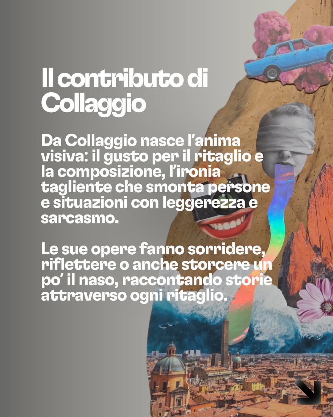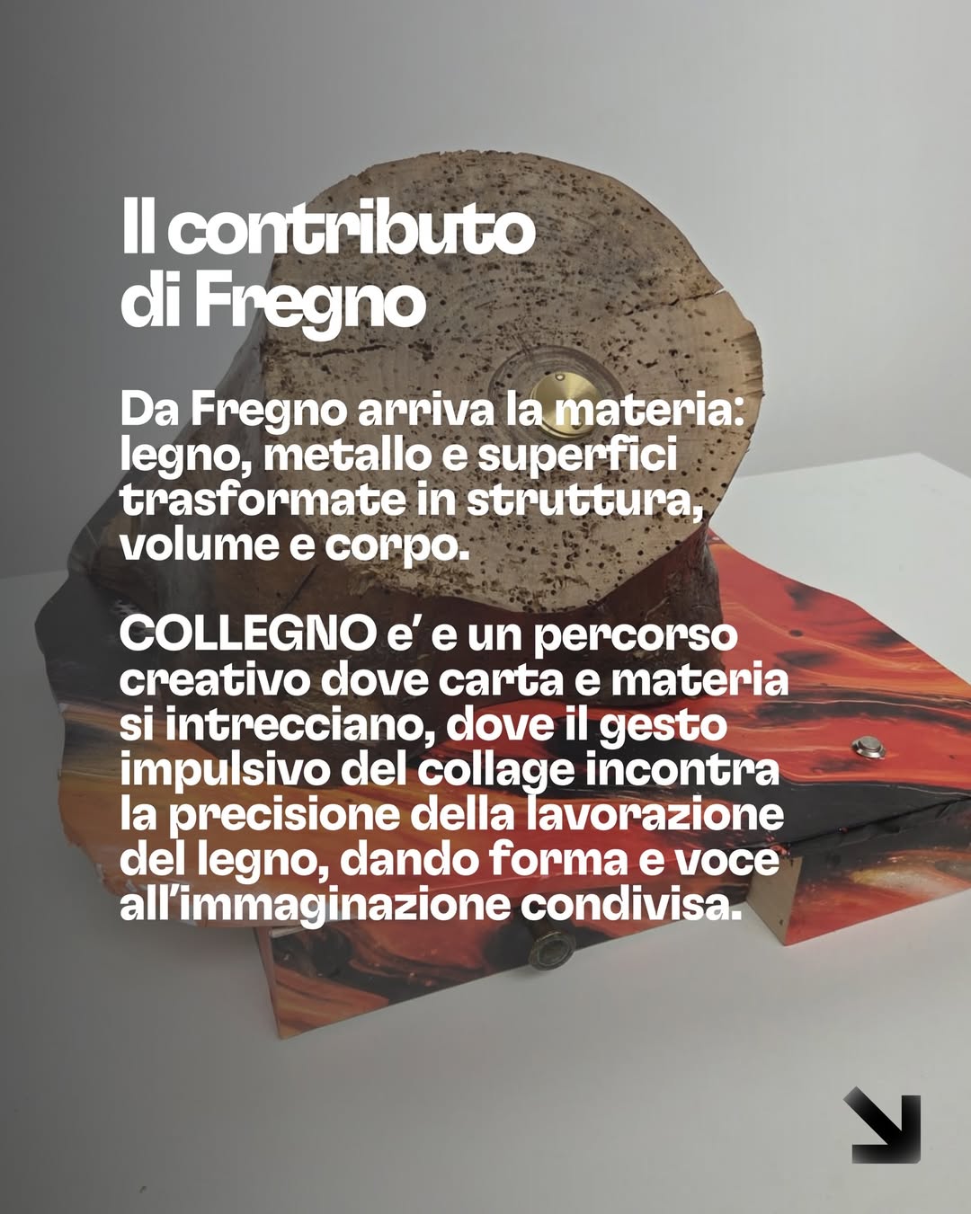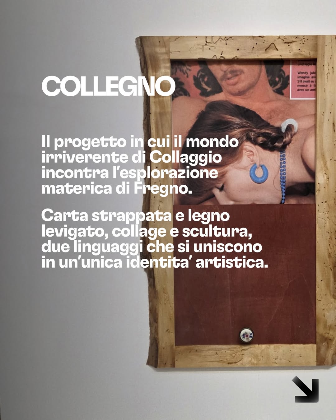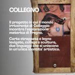 Il mondo irriverente di Collagio incontra la ricerca materica di Fregno: carta strappata e legno levigato, collage e scultura. Due linguaggi diversi che si intrecciano fino a diventare una nuova identità artistica.