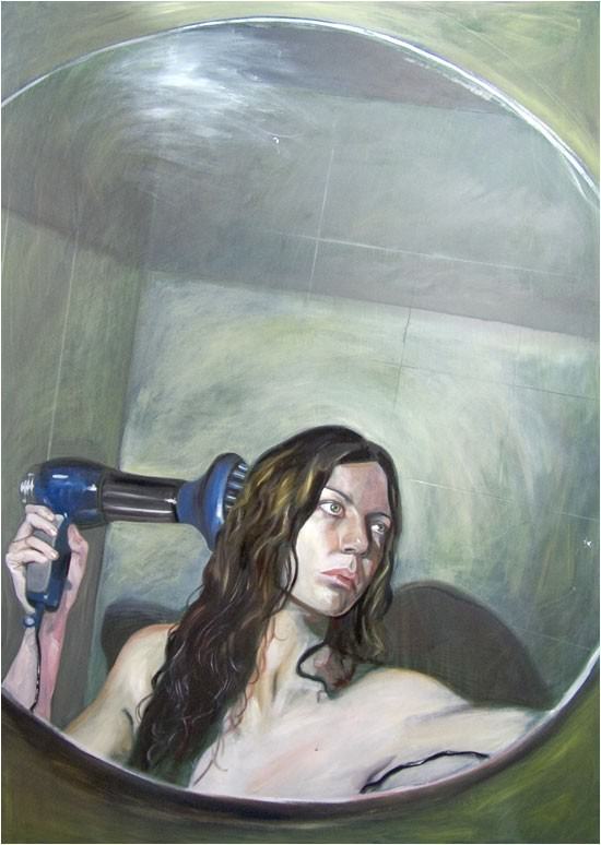 Daniela Benedetti dipinge la solitudine e le angosce delle persone comuni attraverso uno stile essenziale ed esistenziale. Luoghi inconsueti nella figurazione: bagni scabri e abbandonati a loro stessi in cui si respira un clima di solitudine stantia. Spazi desolati ma illuminati dalla presenza di un volto femminile, il volto dell’artista, assorto nella contemplazione di una interiorità che si domanda come riconciliarsi con il lato oscuro del reale, rimanendo in una dimensione sospesa nell’ipotesi di una via d’uscita che possa dileguare l’incubo e fare presa su di una realtà non rassicurante ma più facilmente dominabile.