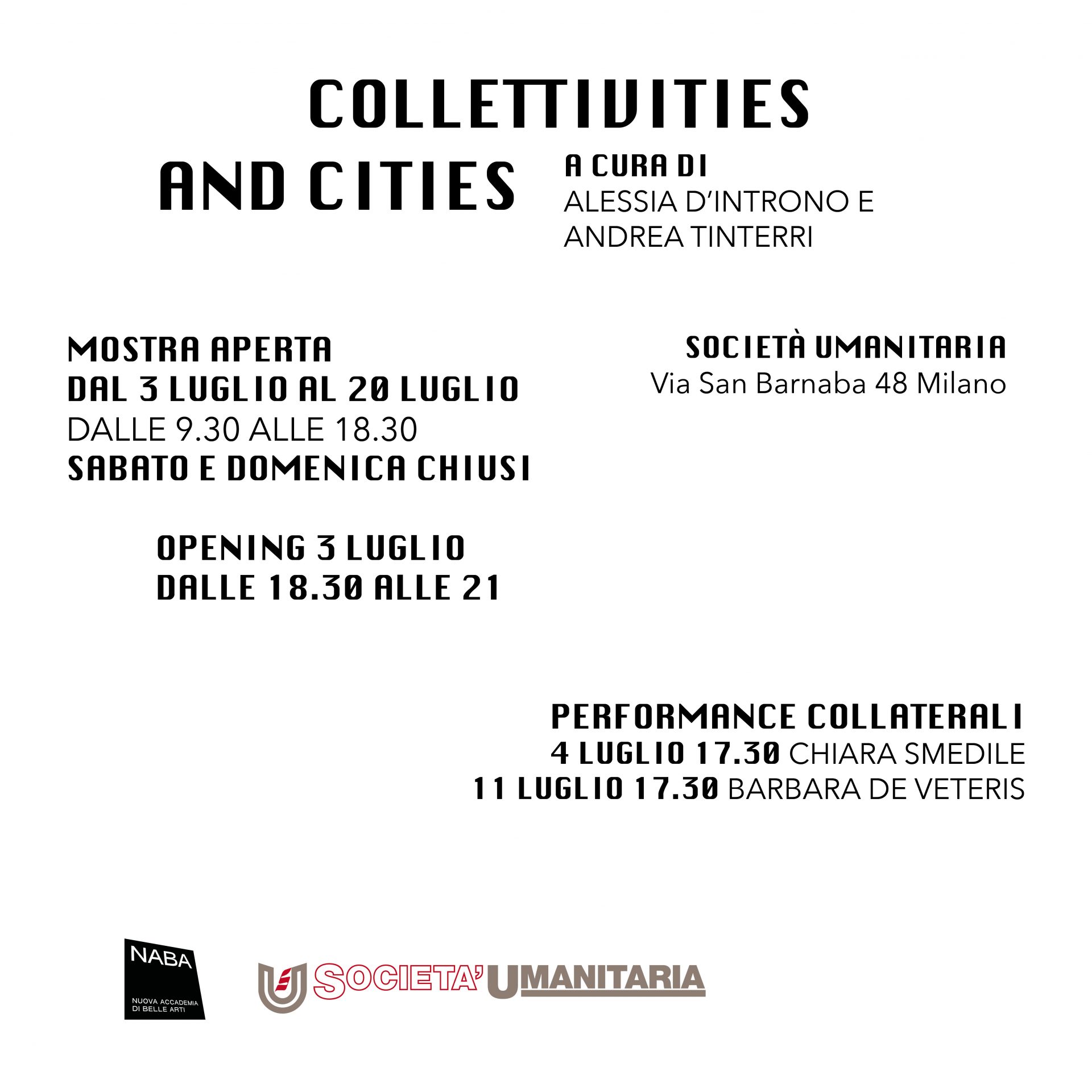 Lunedì 3 luglio dalle ore 18.30 alle 21 negli spazi della Società Umanitaria di Milano, inaugura la mostra Collettivities and Cities frutto della collaborazione tra Naba, Nuova Accademia Di Belle Arti e
