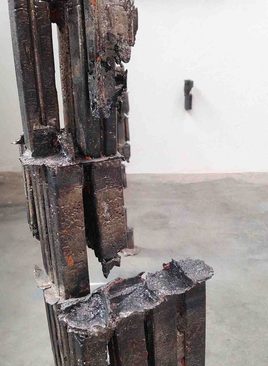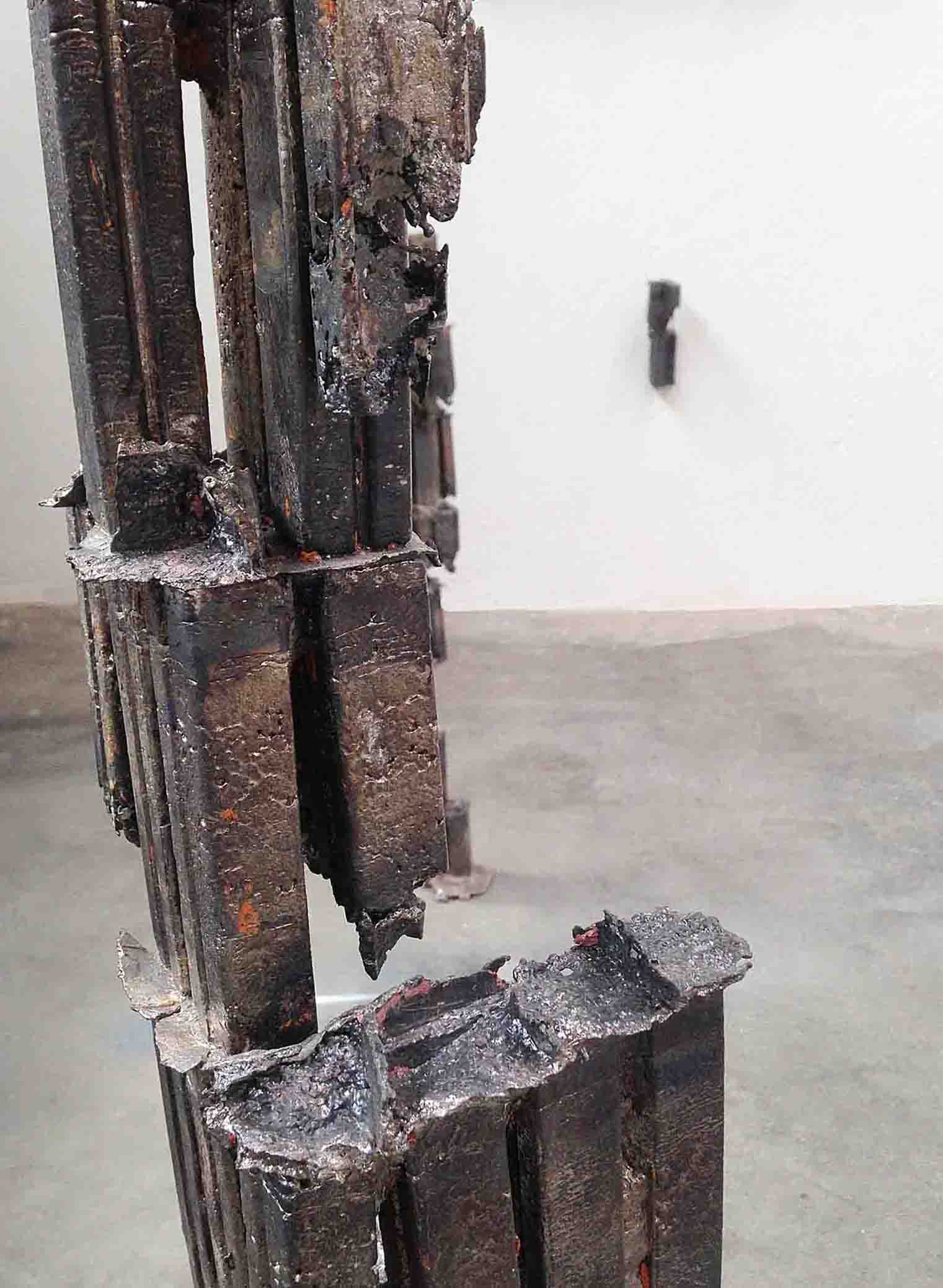 Il tema conduttore è l’aspirazione a una pienezza di senso, secondo un tragitto che va dall’iconografia al simbolo. Le opere di Marco La Rosa presentate in mostra sono perlopiù strutture in piombo e in cemento che occupano tridimensionalmente lo spazio (posizionate sia a terra, sia a parete), evocando i concetti di memoria, di distruzione di un contenitore esterno per far nascere o emergere la forma che è racchiusa al suo interno, di riempimento di un’assenza attraverso la materia viva della scultura, che colma di Presenza e insieme di Mistero quell’involucro vuoto che la vita rischia di rimanere quando non sia toccata dalla ricerca o dalla scoperta del senso.