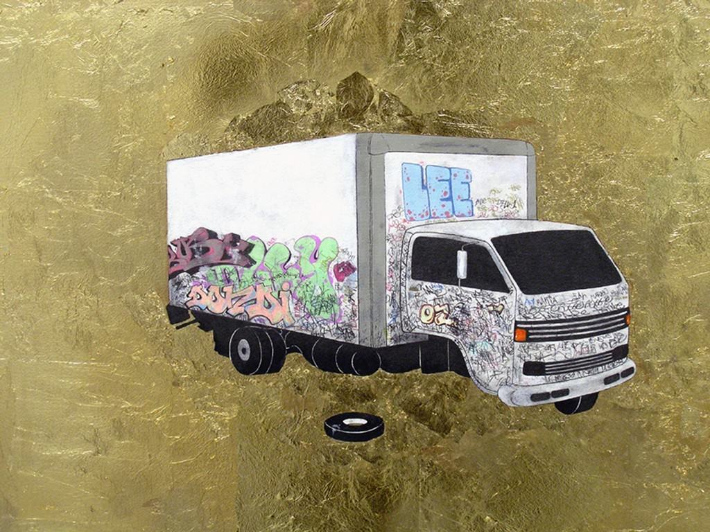 Il video di Jeremy Bailey, l’unico video presentato in mostra, ci colloca proprio dove vogliamo trovarci: nel mezzo di una discussione tra il “bello” ed il “teorico”, “l’estetica” e la “concettualita’”. Facendo ricorso ad una tecnologia web, il video di Bailey che lo riproduce nella sua action-painting, si immerge nel punto di contatto tra la “mano d’artista” e la riproduzione meccanica. Il grande disegno di William Cordova che riproduce un autocarro con dei graffiti non solo riflette le attenzioni del giovane artista verso le forme di arte clandestina, ma tiene conto anche del concetto di scelta accompagnata dall’opportunità che è parte dell’azione del graffitismo. Lo stile selvaggio di Cordova è ulteriormente accentuato dalla disposizione del colore all’interno del soggetto del suo disegno, come se il camion fluttuasse in un mare di bianco. Le donne nei disegni di Chitra Ganesh sono spesso fluttuanti. Mentre molto del suo lavoro si è concentrato sull’eroismo delle figure femminili, i colori dell’artista collocano le sue donne all’interno dell’impalcatura delle donne di colore, in particolar modo indiane, e dei loro viaggi ora fantastici ora terreni. Allo stesso modo, Kevin Ei-Ichi DeForest è coinvolto nella teoria del colore attraverso i temi della definizione e delle relazioni sociali. Nella sua serie continua di copertine di dischi, DeForest rappresenta e indaga la sua biografia di mezzo-Giapponese e mezzo-Canadese in una cultura meticcia. Wangechi Mutu riesce a renderci magiche immagini di colore nei suoi collages di disegni su velluto. Le sue figure, rappresentate in maniera appena riconoscibile, sembrano provenire da un altro mondo, e i loro corpi sembrano mascherare gli effetti di una sorta di catastrofe. Gli acuti ritratti di uomini in costume di Jeff Sonhouse, o di uomini che indossano una maschera, ci suggeriscono quelle finzioni che ci consentono di affrontare questo mondo ostile. Amplificati dal colore i ritratti di Sonhouse portano i grandi temi dell’umanità ad un livello supremo, abbandonando i temi della razza e del luogo per rappresentare senza differenze un essere umano che ha vissuto l’apocalisse e continua a vivere. Mentre le figure di Mutu sembrano essere rinate da una morte bellissima, e quelle di Sonhouse sembrano armate per l’ inevitabile, le sculture di Roberto Visani ricavate dall’assemblaggio di armi usate sembrano volere interpretare la violenza del nostro momento.