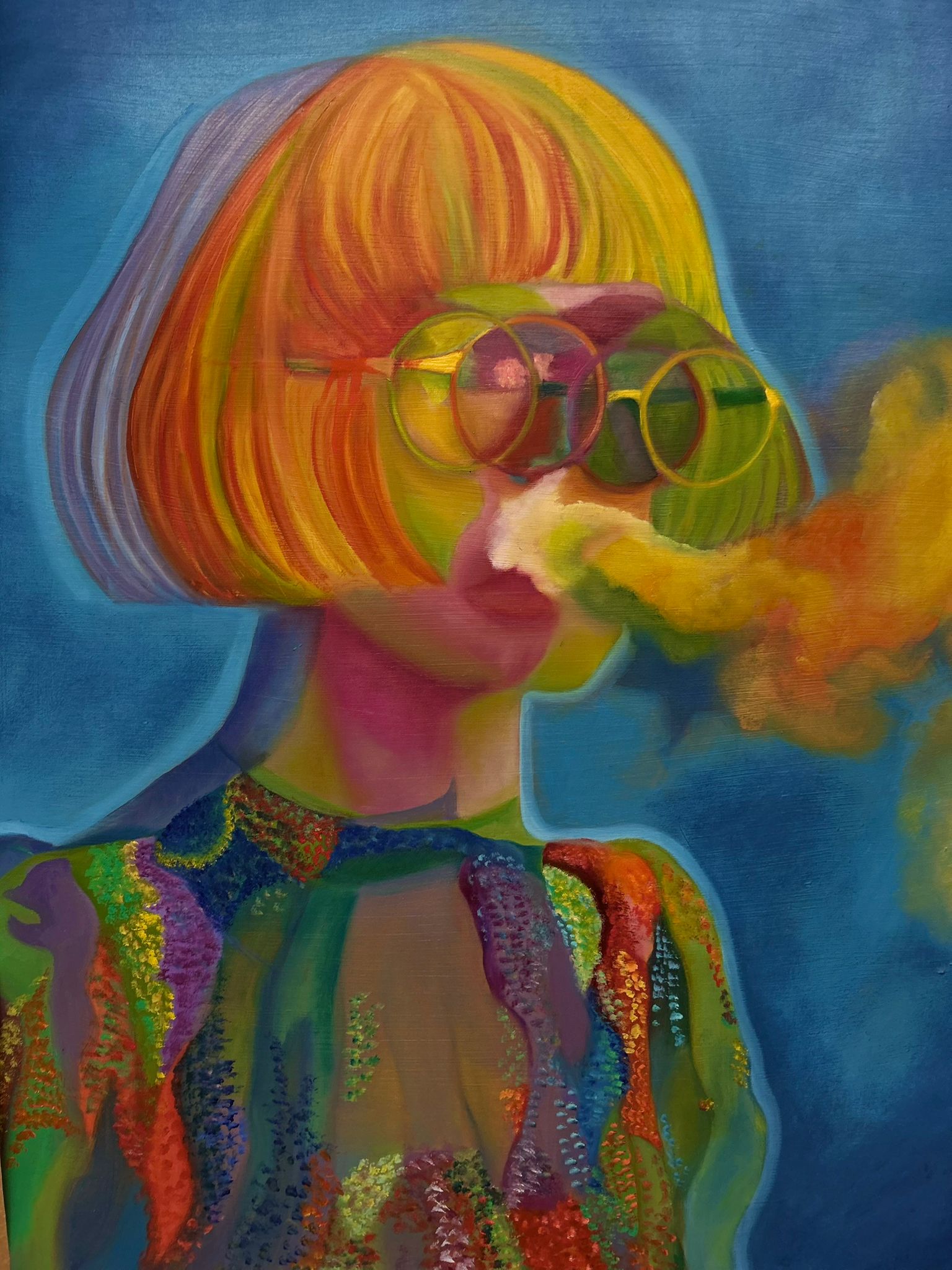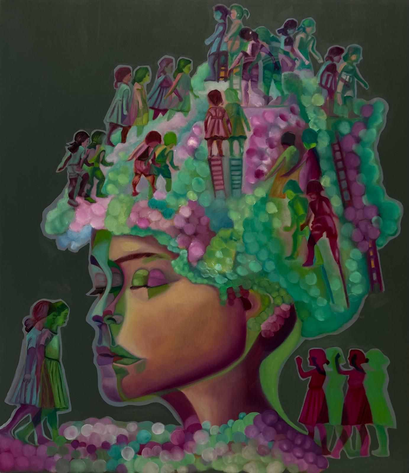 In questo gruppo di opere la ricerca dell’artista si concentra sui visi che diventano protagonisti di espressioni e portatori di esperienze. I soggetti, ritratti spesso in duplice figura, sembrano sfuggire a una definizione univoca: i profili si moltiplicano, si sovrappongono o si rifrangono nello spazio, restituendo allo sguardo dell’osservatore una percezione instabile, in continuo mutamento. I colori sono vividi e in alcuni casi richiamano un’estetica pop, aprendo un dialogo più diretto e immediato con il pubblico, senza rinunciare però alla profondità emotiva che attraversa l’intero percorso dell’artista.