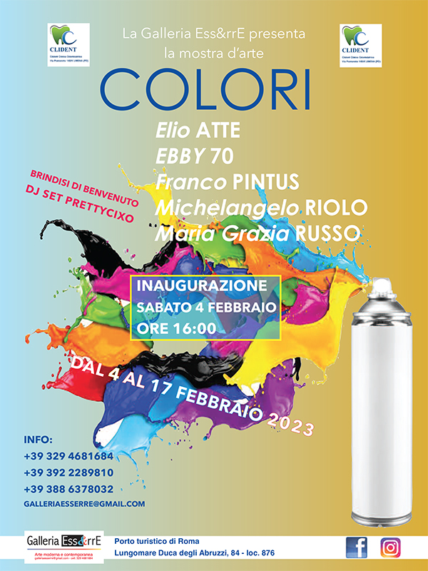 Al Porto turistico di Roma alla Galleria Ess&rrE inauguriamo la mostra “COLORI” con gli artisti Elio Atte, Ebby 70, Franco Pintus, Michelangelo Riolo e Maria Grazia Russo. Questa nuova bellissima pentapersonale dal titolo che parla chiaro.