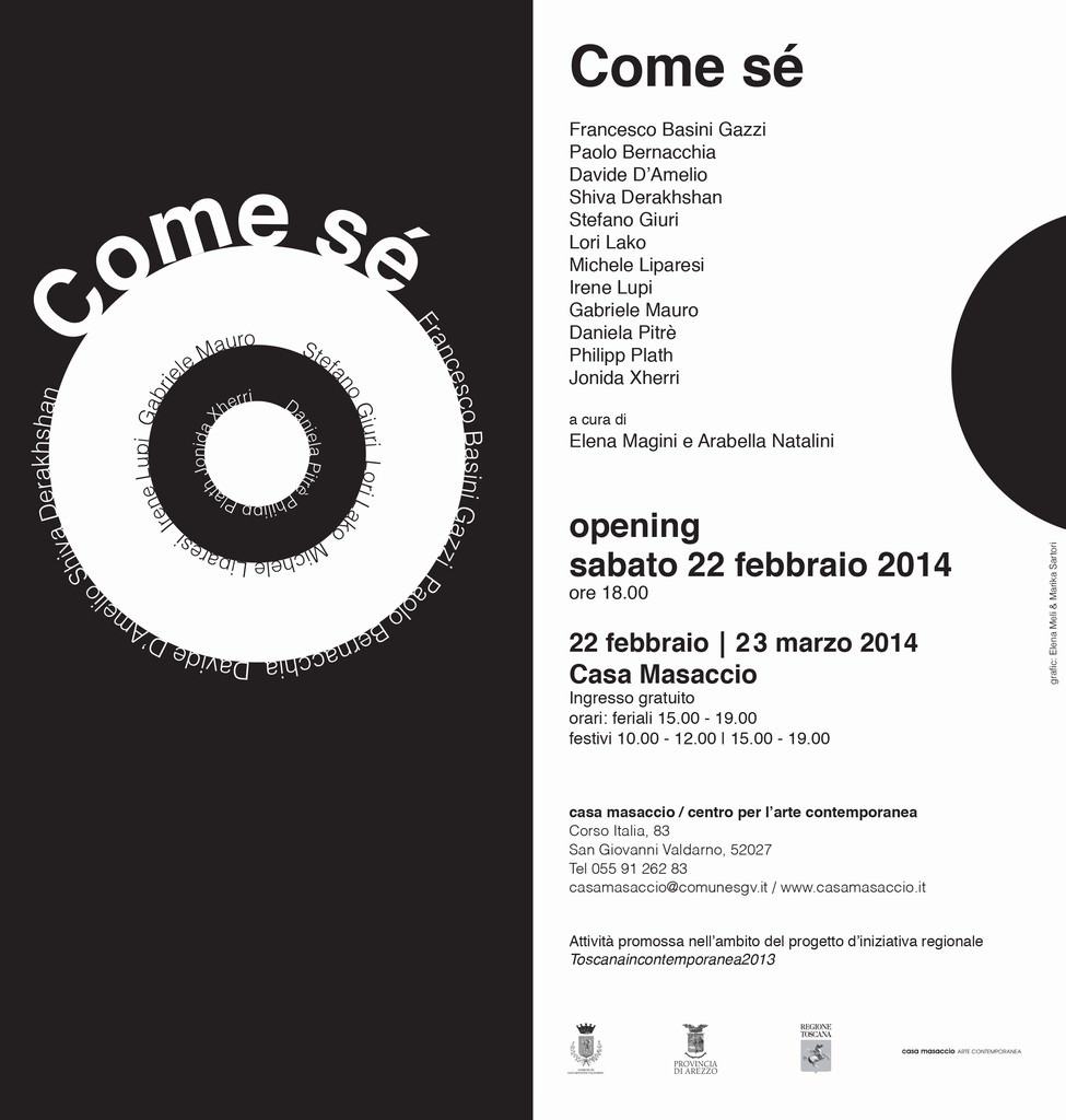 Come sé prende le mosse dal workshop condotto da Arabella Natalini e Elena Magini su richiesta della consulta degli studenti dell’Accademia di Belle Arti di Firenze. Il laboratorio, incentrato su un’ipotesi di costruzione di un progetto espositivo come autorappresentazione, è stato avviato nella primavera 2013 e, a partire da questo, i dodici giovani artisti selezionati hanno ideato i lavori presenti in mostra.