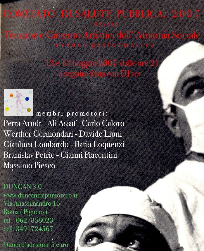 Sabato 12 e domenica 13 maggio 2007 a partire dalle ore 21.00 il Centro di danza e arti contemporanee DUNCAN 3.0 ospiterà presso i suoi nuovissimi locali il primo COMITATO DI SALUTE PUBBLICA, 2007 che si propone di perseguire obiettivi tangibili finalizzati al benessere sociale attraverso l’ottimizzazione della qualità della vita materiale e spirituale, individuale e collettiva.
