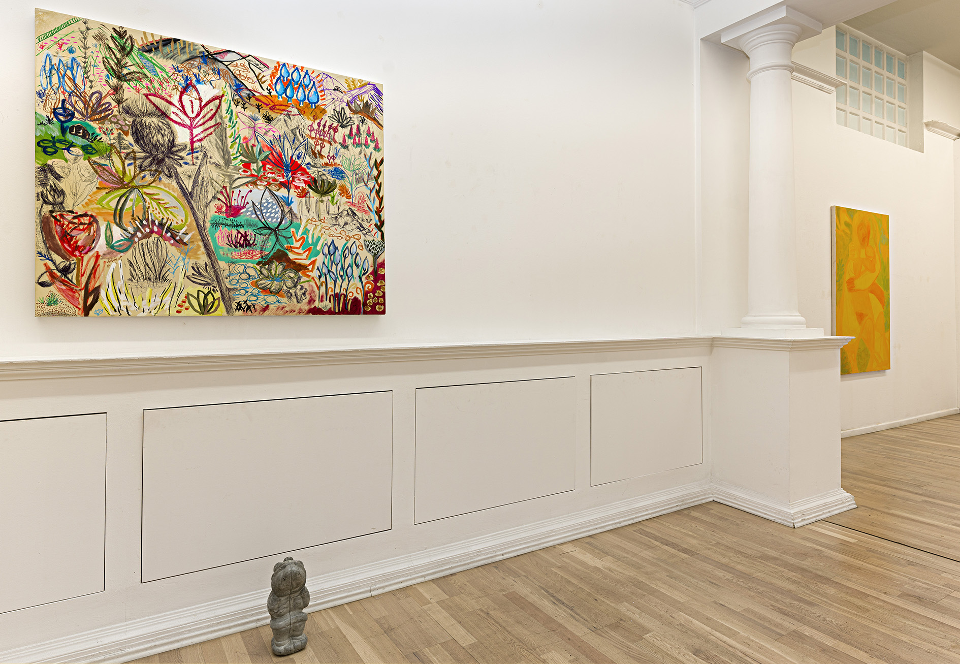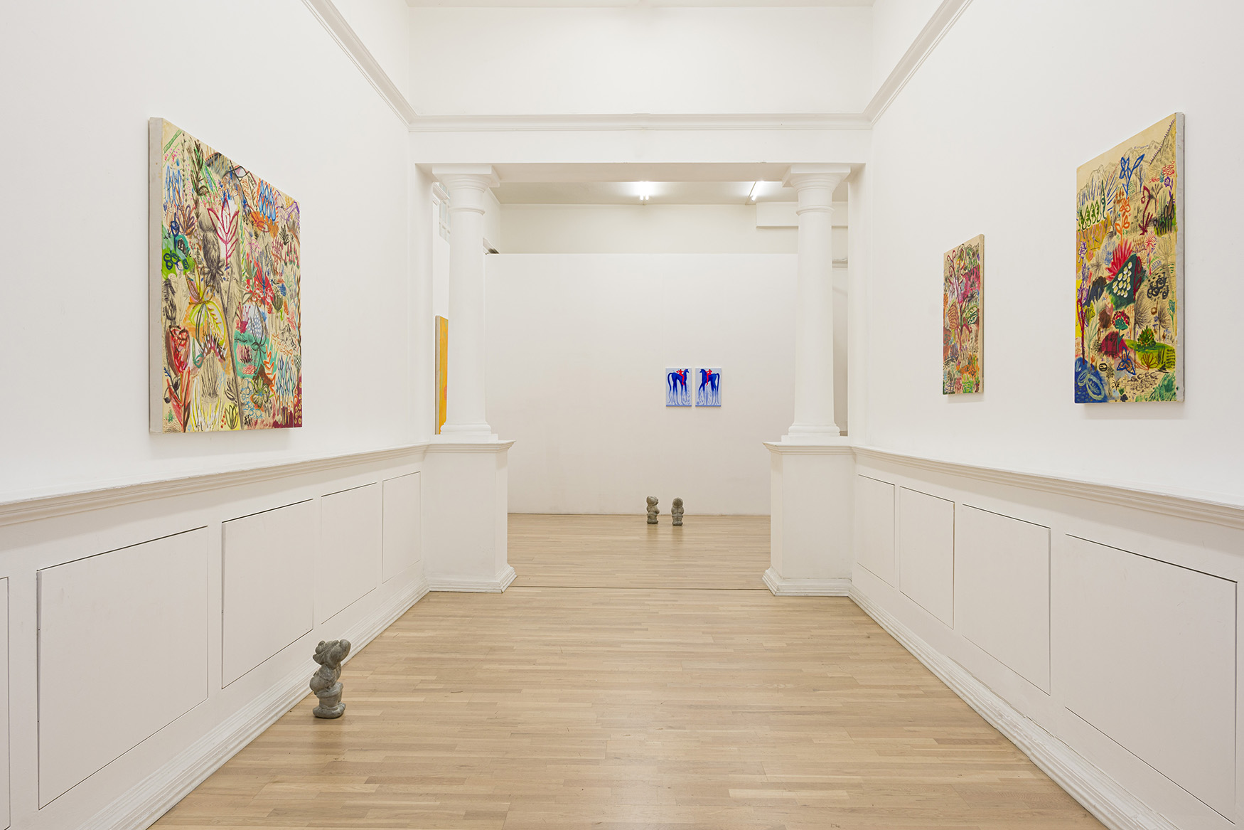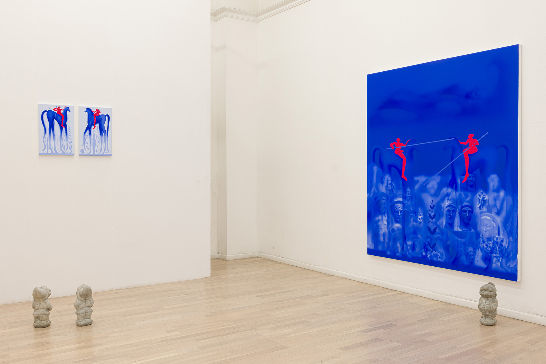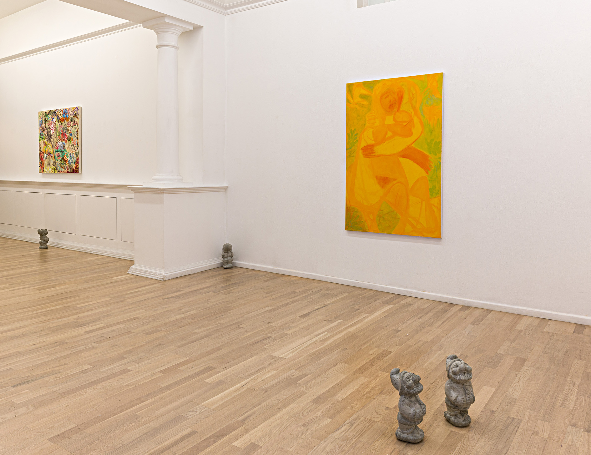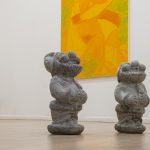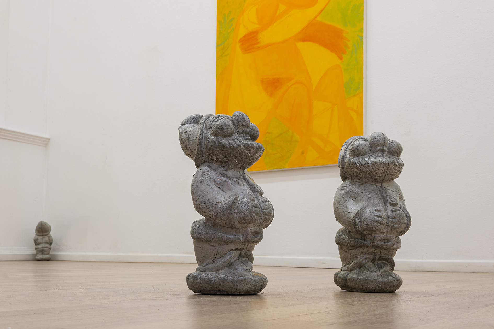I Nani da giardino tutti uguali, anche se non identici, di Francesco Bendini costituiscono un contrappunto rispetto ai quadri, un’interrogazione critica che si colloca dalla parte concettuale della filosofia piuttosto che dell’estetica, che – come abbiamo visto sopra – lusinga l’occhio senza remore e fa appello alle emozioni. I nani sono dei calchi in cemento di un nano in pietra recuperato chissà dove e poi “liberato”, le sculture sono poi ripassate con una patina che le lucida, ma non occulta il materiale grezzo e ottuso sottostante. Viene chiamato in causa il cliché del nano, l’arte popolare che sfocia nell’artigianato e nel kitsch. L’opera volutamente non autoriale di Francesco, si interroga allora sullo statuto dell’arte, i suoi confini, le sue regole, che sovverte con un sorriso ironico e paradossale.