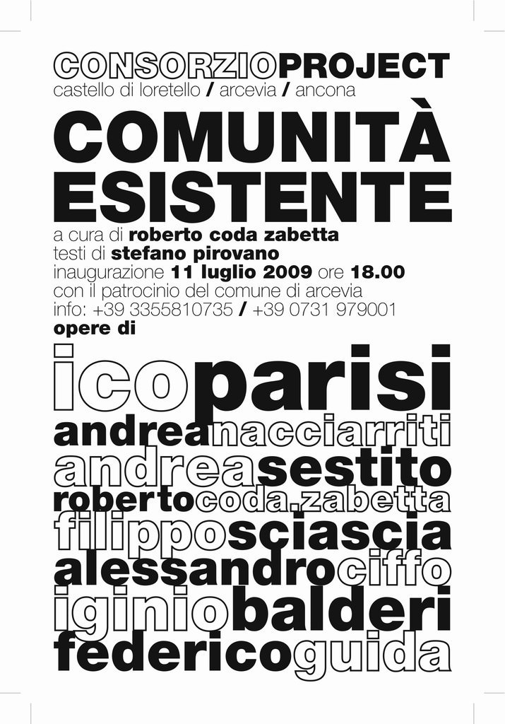 Comunita’ Esistente è una mostra che ha due anime. La prima e’ quella di perseguire in chiave contemporanea un progetto molto importante chiamato Operazione Arcevia Comunità Esistenziale, ideato all’inizio degli anni Settanta da Ico Parisi, Enrico Crispolti, Pierre Restany e Italo Bartoletti. La seconda seconda radice, seguendo il filo logico e culturale che questo grande evento ha lasciato, e’ quella che sta nella volontà di rinnovare questa utopia intorno alla vecchia sede del Consorzio Agrario di Loretello, oggi diventato Consorzio Project 2009.