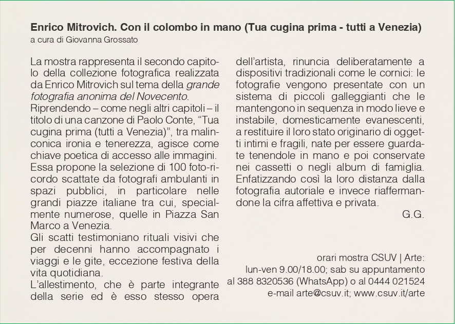 CSUV|Arte è lieto di presentare una nuova mostra di istallazioni fotografiche di Enrico Mitrovich, a cura di Giovanna Grossato, “Con il colombo in mano (Tua cugina prima – tutti a Venezia)” che rappresenta il II capitolo del progetto dedicato dall’Autore alla grande fotografia anonima del Novecento.