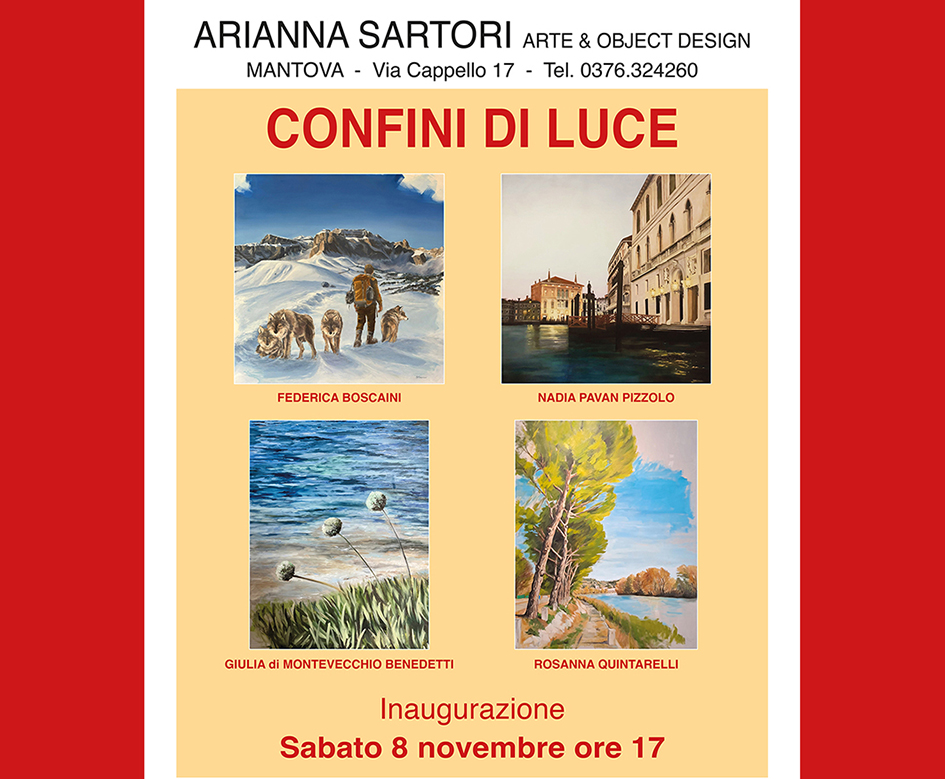 “Confini di luce. Dipinti di: Federica Boscaini, Giulia di Montevecchio Benedetti, Nadia Pavan Pizzolo, Rosanna Quintarelli” è la mostra che la Galleria Arianna Sartori inaugurerà Sabato 8 novembre alle ore 17.00 alla presenza degli Artisti nella sala di via Cappello 17 a Mantova.
