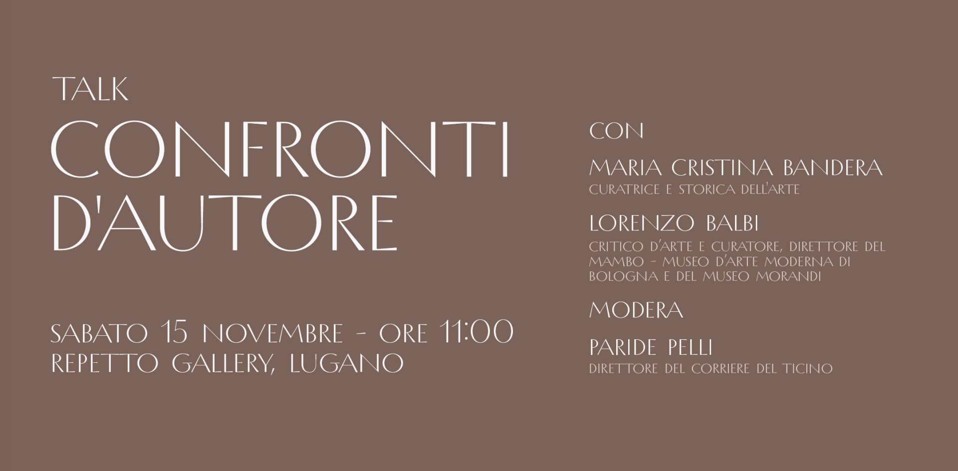 Talk di approfondimento della mostra con la curatrice Maria Cristina Bandera e Lorenzo Balbi, Direttore del MAMbo – Museo d’Arte Moderna di Bologna e del Museo Morandi, accompagnati dal Direttore del Corriere del Ticino, Paride Pelli, che modererà la conversazione.