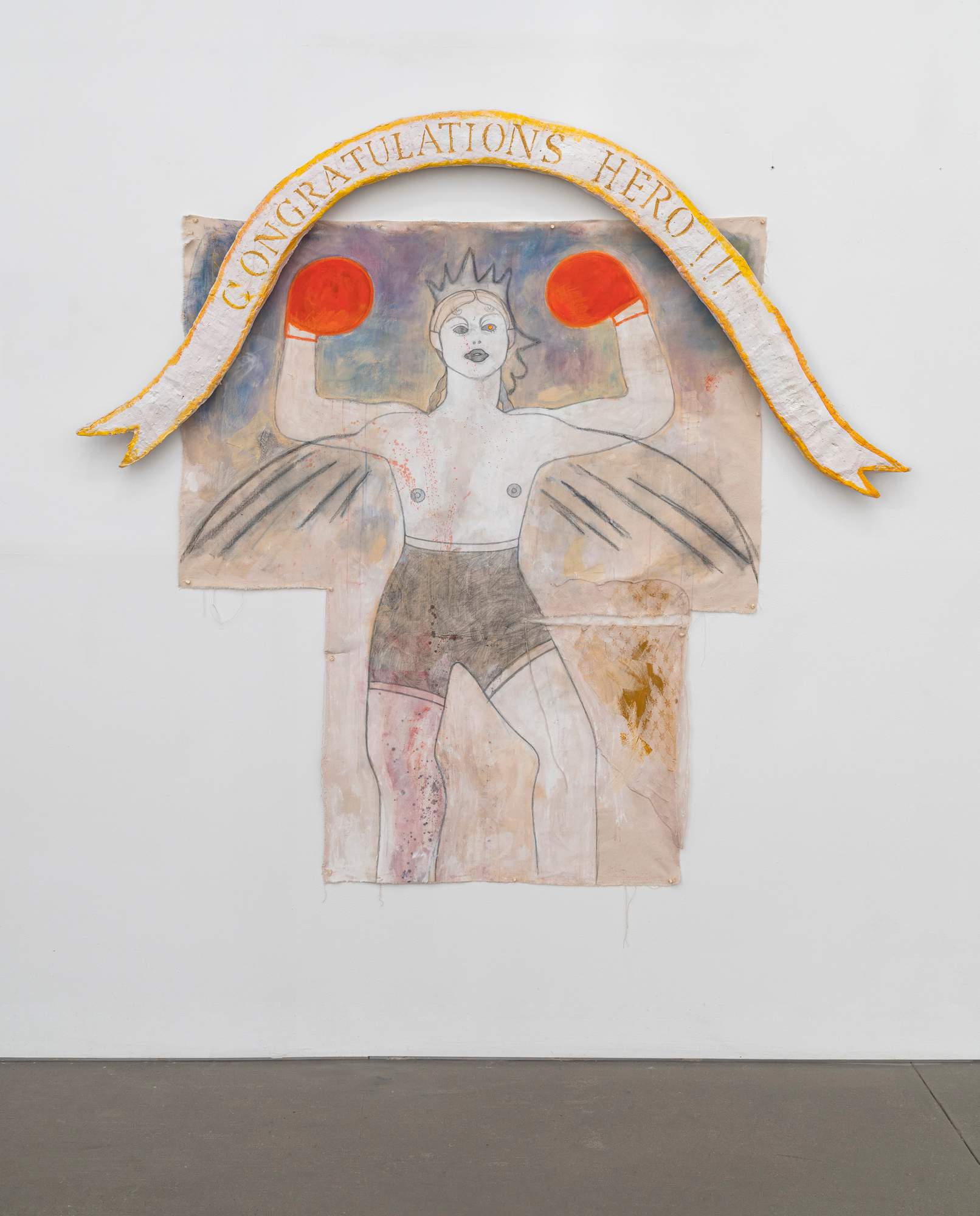 Congratulations Hero !!! è anche il nome dell’opera chiave esposta in mostra, dove una mitologica figura femminile alza i guantoni in segno di vittoria. L'opera cattura il momento post-conflitto, esplorando il significato della vittoria in relazioni complesse e le emozioni contrastanti che ne derivano. Una Nike contemporanea che ha vinto all’ultimo round: fiera, alata e finalmente provvista di corona, ma anche sudata e sporca del sangue dei colpi inferti e subiti.