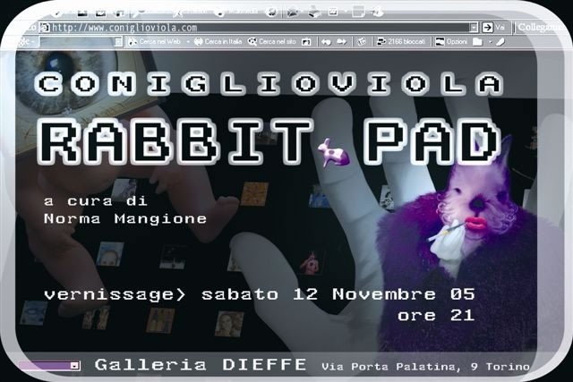 Lo spazio della galleria sarà trasformato in una protesi dello spazio virtuale, in una sorta di isola lontana dal mondo reale, un “tappeto”, come un grande mouse-pad, anzi rabbit-pad , dove rilassarsi e godersi il viaggio nel mondo surreale di ConiglioViola.
