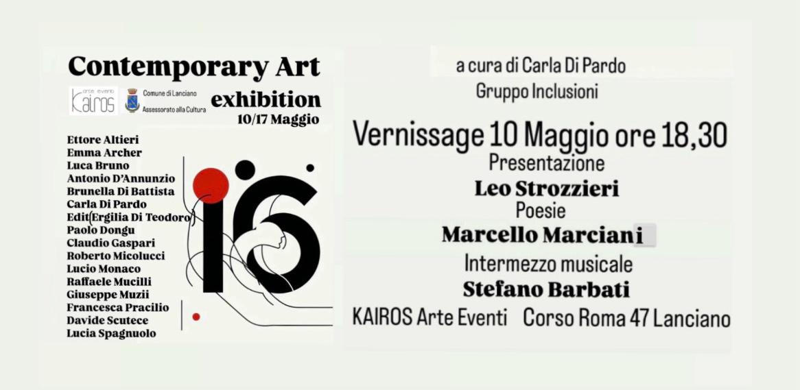 La mostra Contemporary Art exhibition 16 un collettivo di arte contemporanea che vede coinvolti 16 artisti in dialogo tra loro. Si spazia dall’astrattismo al figurativo dalla scultura alla pittura all’informale. La mostra evento prevede il vernissage alle ore 18,30 con presentazione testo critico Leo Strozzieri, redai ng di poesie di Marcello Marciani e intermezzo musicale con il chitarrista Stefano Barbati.