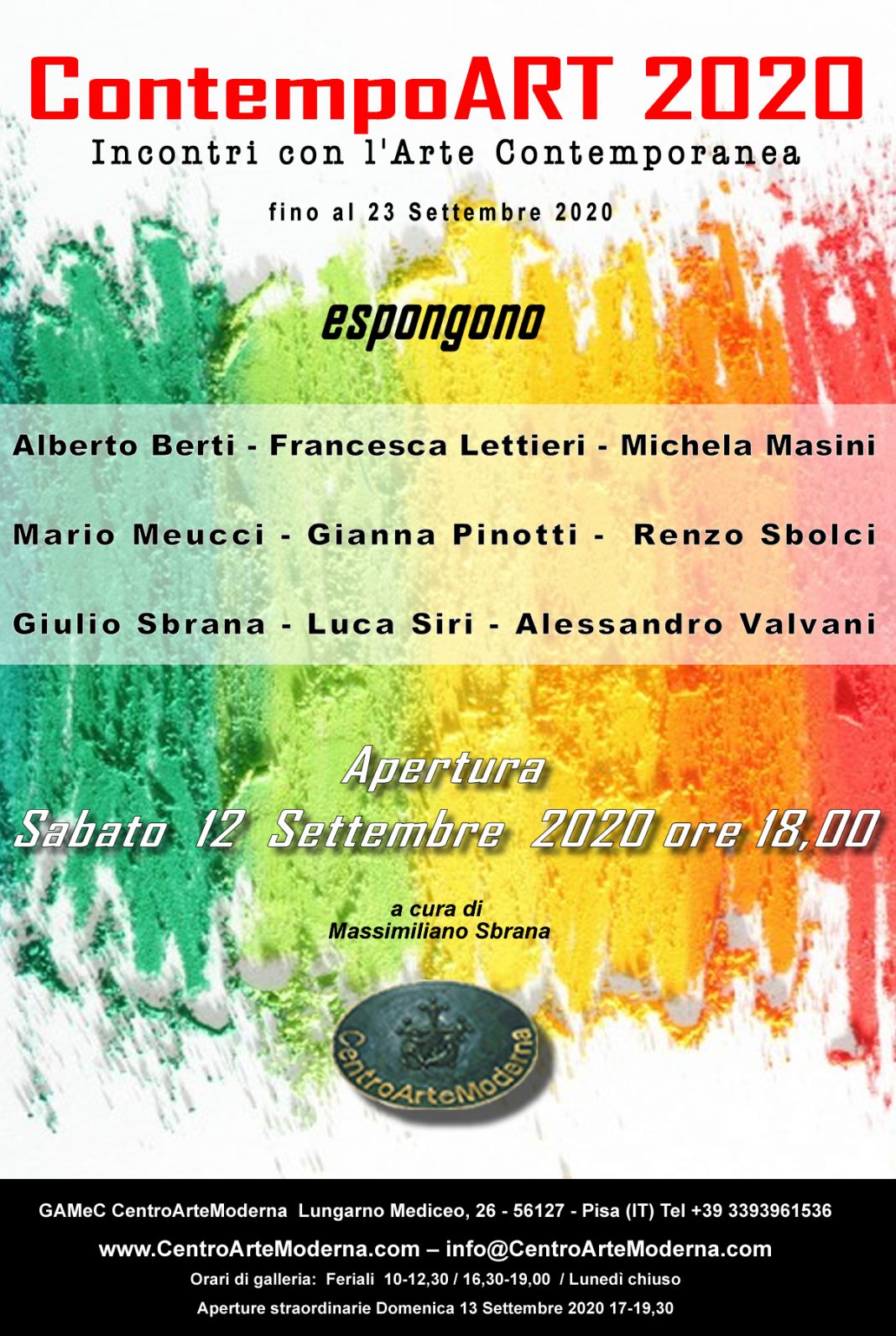 Si apre al pubblico Sabato 12 Settembre 2020 alle ore 18,00 presso gli spazi espositivi della Galleria d'Arte Moderna e Contemporanea CentroArteModerna di Pisa, a cura di Massimiliano Sbrana, sul Lungarno Mediceo al n.26, la XXVIa Edizione di "ContempoART 2020 / Incontri con l'Arte contemporanea" .