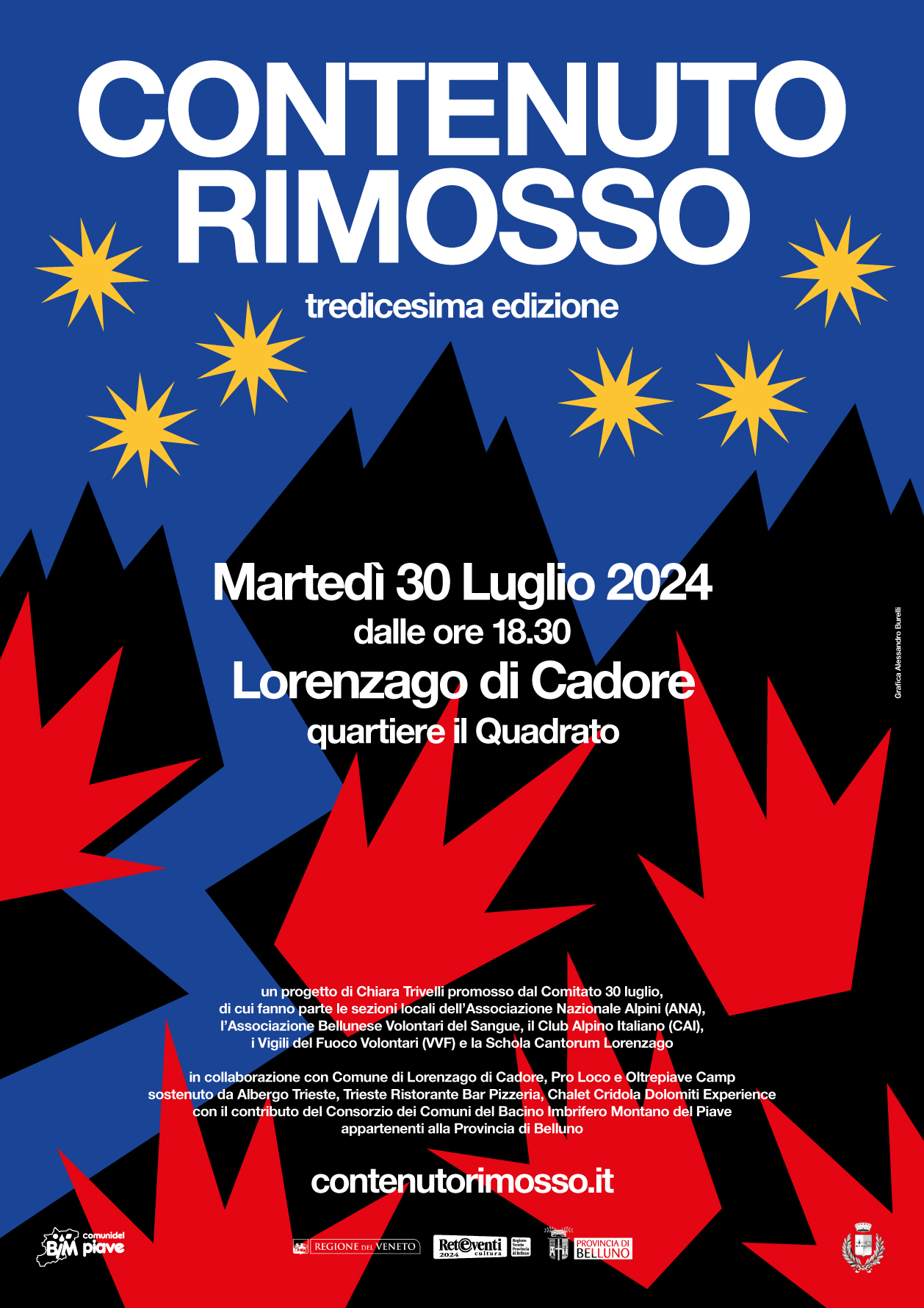 un progetto di Chiara Trivelli promosso dal Comitato 30 luglio, di cui fanno parte le sezioni locali dell’Associazione Nazionale Alpini (ANA), l’Associazione Bellunese Volontari del Sangue, il Club Alpino Italiano (CAI), i Vigili del Fuoco Volontari (VVF) e la Schola Cantorum Lorenzago, in collaborazione con Comune di Lorenzago di Cadore, Pro Loco e Oltrepiave Camp, sostenuto da Albergo Trieste, Trieste Ristorante Bar Pizzeria, Chalet Cridola Dolomiti Experience, con il contributo del Consorzio dei Comuni del Bacino Imbrifero Montano del Piave appartenenti alla Provincia di Belluno. Contenuto Rimosso aderisce a RetEventi Cultura Veneto.