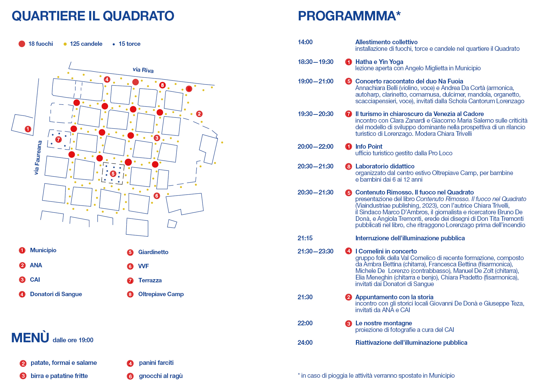 Nella ricorrenza dell’incendio che distrusse l’antico abitato il 30 luglio 1855, Contenuto Rimosso prevede l’interruzione dell’illuminazione pubblica, l’installazione di fuochi, candele e torce, l’attivazione di situazioni di convivialità, arte e approfondimento culturale nel quartiere il Quadrato a Lorenzago di Cadore.
