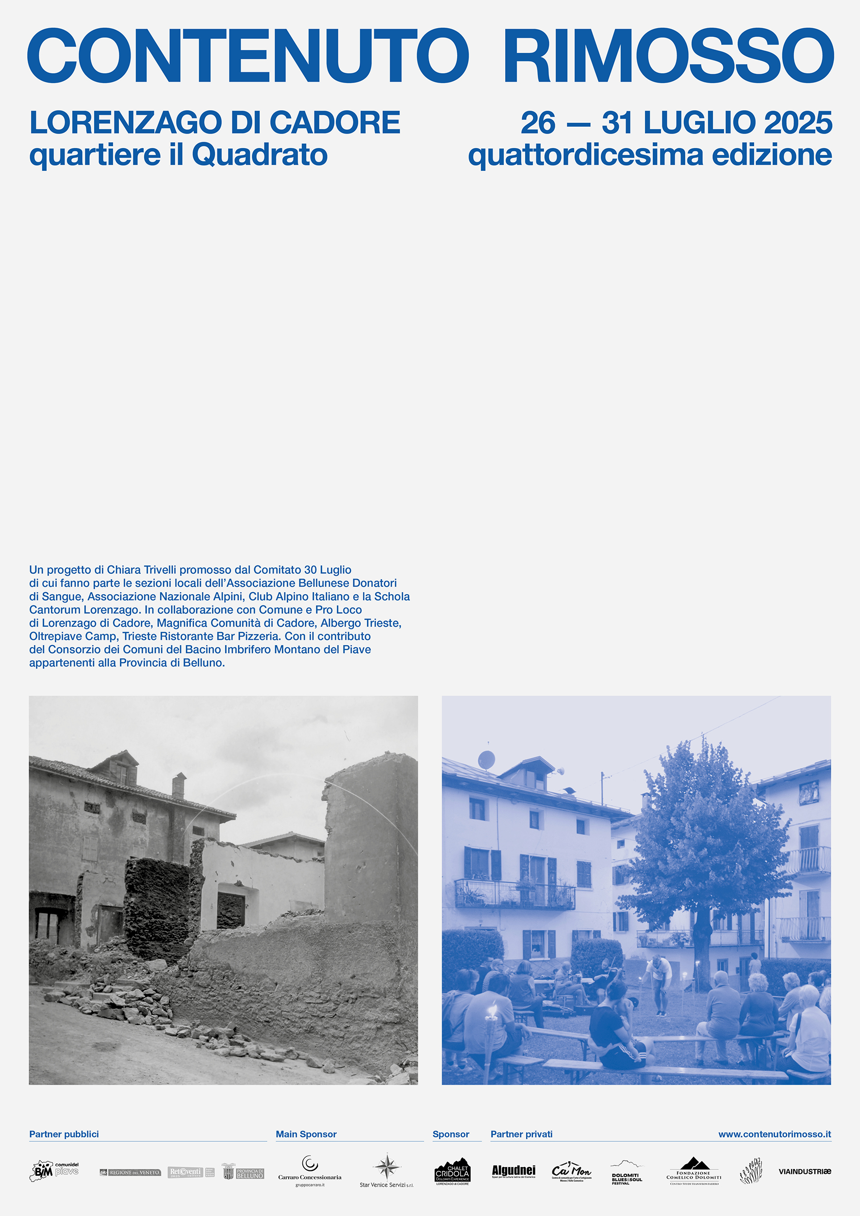In occasione della ricorrenza dell’incendio che il 30 luglio 1855 distrusse l’antico abitato, Contenuto Rimosso propone dal 2012 l’interruzione dell’illuminazione pubblica e l’installazione di fuochi, candele e torce nel quartiere il Quadrato a Lorenzago di Cadore. Attorno alla ritualità di questo gesto simbolico si attivano ogni anno momenti di convivialità, arte, approfondimento culturale e, da quest’anno, un programma di residenza artistica. Ideato e sviluppato da Chiara Trivelli insieme alla comunità locale, Contenuto Rimosso è un progetto di arte pubblica community-based, che affronta la questione dello spopolamento delle aree montane, sperimentando pratiche artistiche impegnate socialmente in un contesto in cui sopravvivono forme di vita comunitaria che hanno radici secolari.