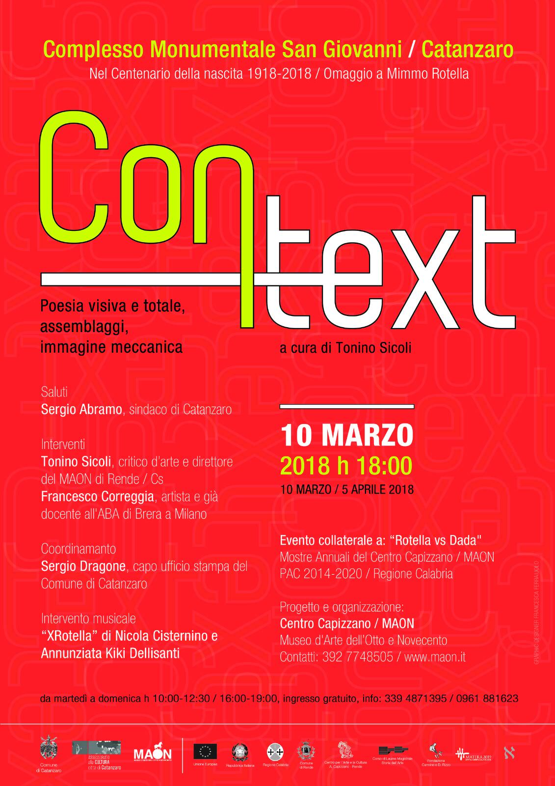 Sarà inaugurata sabato 10 marzo, alle ore 18, al Complesso Monumentale San Giovanni di Catanzaro, la mostra omaggio a Mimmo Rotella “CONTEXT / Poesia visiva e totale, assemblaggi, immagine meccanica”, a cura di Tonino Sicoli, iniziativa collaterale dell’evento espositivo “Rotella vs Dada / Da Duchamp e Man Ray al New Dadaismo” in corso al MAON, Museo d’Arte dell’Otto e Novecento di Rende. La mostra, che resterà aperta fino al 5 aprile, è organizzata dal Centro “A. Capizzano” di Rende – nell’ambito dell'ottava edizione delle Mostre Annuali del Centro Capizzano – MAON, inserita nel PAC 2014-2020 della Regione Calabria - in occasione del centenario della nascita di uno dei maggiori artisti italiani del Novecento, personaggio simbolo della cultura catanzarese. La rassegna gode, inoltre, del patrocinio del Comune di Catanzaro, del Comune di Rende, del Corso di Laurea Magistrale in Storia dell’arte dell’Università della Calabria in intesa, fra gli altri, con Matera Capitale Europea della cultura 2019.