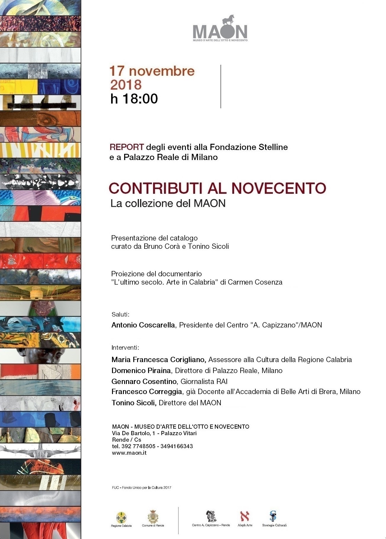 Sabato 17 novembre alle ore 18 si terrà al MAON, Museo d’arte dell’Otto e Novecento di Rende, una serata dedicata agli eventi tenutisi a Milano dal 12 settembre al 14 ottobre 2018, con la mostra CONTRIBUTI AL NOVECENTO. DA BOCCIONI A ROTELLA AI CONTEMPORANEI. LA COLLEZIONE DEL MAON, presso la Fondazione Stelline, e l’incontro con conferenza a Palazzo Reale, inseriti nel palinsesto sul Novecento Italiano, organizzato da Comune di Milano.