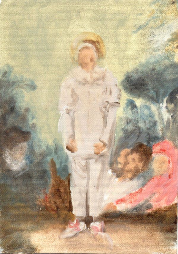 Accanto alla storia dell’arte conosciuta dai più, si leva dunque un controcanto, una voce che ora si mescola, ora si distingue, arricchendo la melodia principale. La si sente spuntare piano pianissimo, insieme all’erba olandese baciata dal sole di Het Hollandse Landschap (or After Ruisdael), rifacimento di un paesaggio di Ruisdael, di Michele Tocca, salire e arricciarsi nelle chiome e, poi, indulgere fra le nuvole del cielo, per farsi più decisa e ferma sulle mani contadine, nelle scene rurali post Millet e Van Gogh, dipinte da Sigrid Holmwood. Esse profumano di orto e di fiori, di terra e di pietre con cui la pittrice, recuperando le ricette antiche, macina i suoi stessi pigmenti, risvegliando la nostra lunga appartenenza al mondo della natura e della lentezza. In crescendo, la melodia scivola lungo le pennellate pastose di Enzo Marra, evocando cene da Wheeler’s nella Londra anni Cinquanta e celebri esposizioni, di cui Marra spia spettatori e potenziali collezionisti. Infine, forte fortissimo e a ritmo serrato, dal canto si stagliano ad una ad una le voci delle centinaia variazioni di Gilles, celebre Pierrot di Jean-Antoine Watteau, rivisitato qui da Sebastiano Impellizzeri con le sue Postcards from Gilles: “cartoline” che, insieme ad ognuna delle opere in mostra, appuntano ciascuna una possibile differente storia nella Storia.