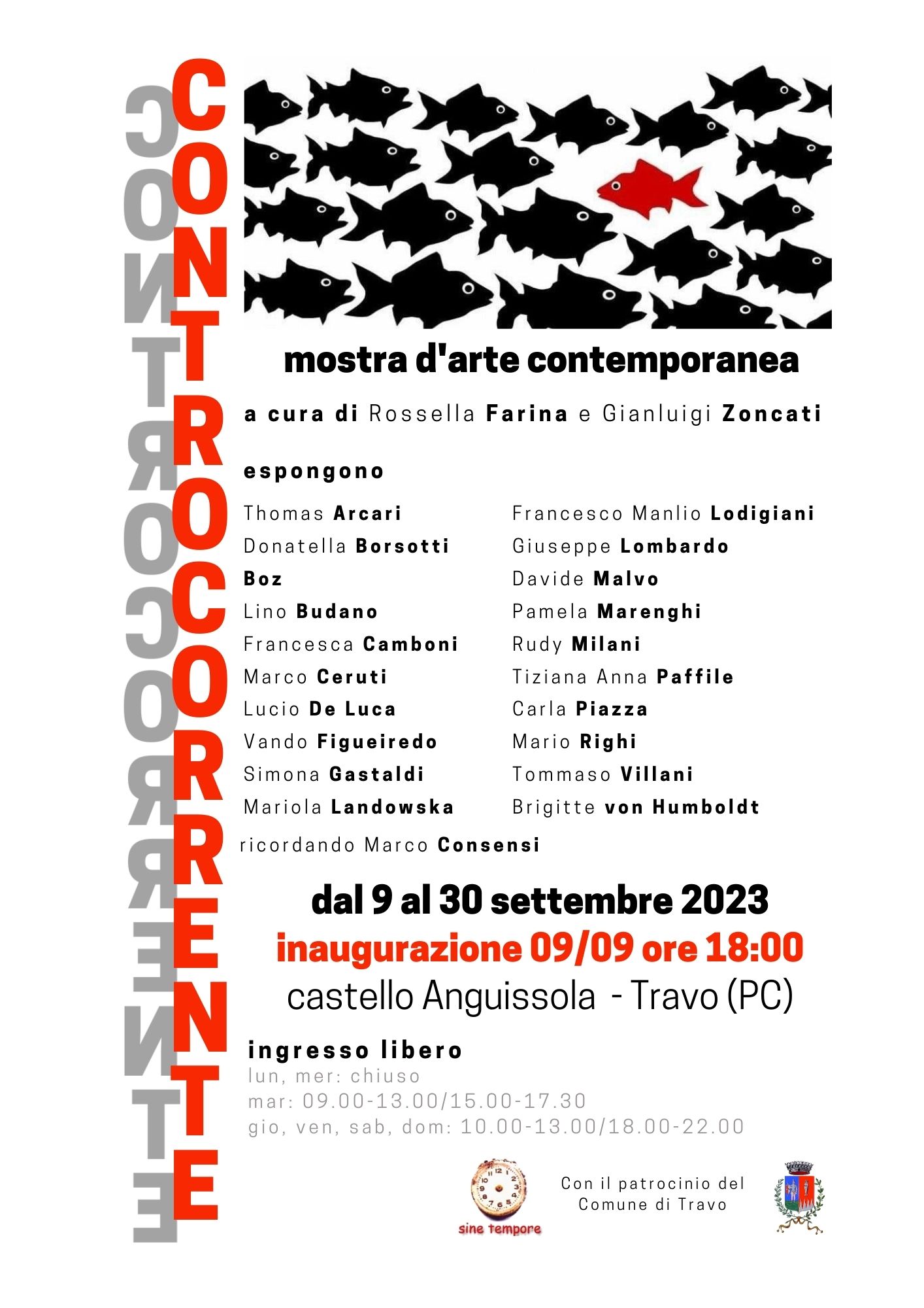 Dal 9 Settembre al 30 Settembre 2023, il Castello Anguissola di Travo (PC), ospiterà la mostra di arte contemporanea “Controcorrente”, organizzata dall’Associazione Sine Tempore con il patrocinio del Comune di Travo (PC).