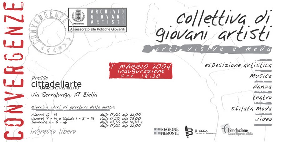 Il progetto di "Convergenze 2004", promosso dall’Archivio Giovani Artisti del Comune di Biella, ormai da qualche anno rappresenta uno degli eventi maggiori nell’ambito della politica di promozione dedicata alla giovane creatività del territorio da parte dell’Assessorato alle Politiche Giovanili.