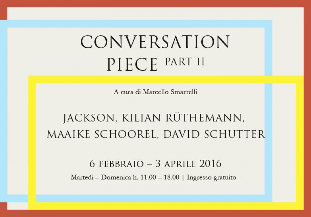 La Fondazione Memmo-Arte Contemporanea presenta Conversation Piece | Part 2, la seconda di una serie di mostre dedicate agli artisti italiani e stranieri che hanno deciso di svolgere una residenza a Roma, in maniera autonoma, ospiti delle fondazioni, degli istituti di cultura o borsisti presso le accademie straniere. Gli artisti invitati per questo appuntamento sono: Jackson, Kilian Rüthemann, Maaike Schoorel, David Schutter.