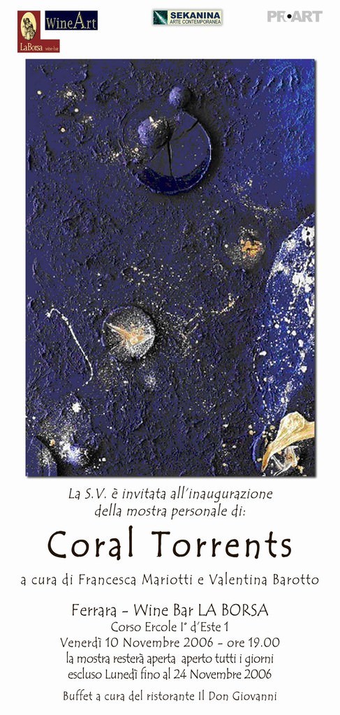 Venerdì 10 novembre 2006, alle ore 19:00, l’Associazione Culturale Ferrara Pro Art inaugurerà la mostra dell’Artista Coral Torrent’s. La mostra si protrarrà fino al 24 novembre 2006.