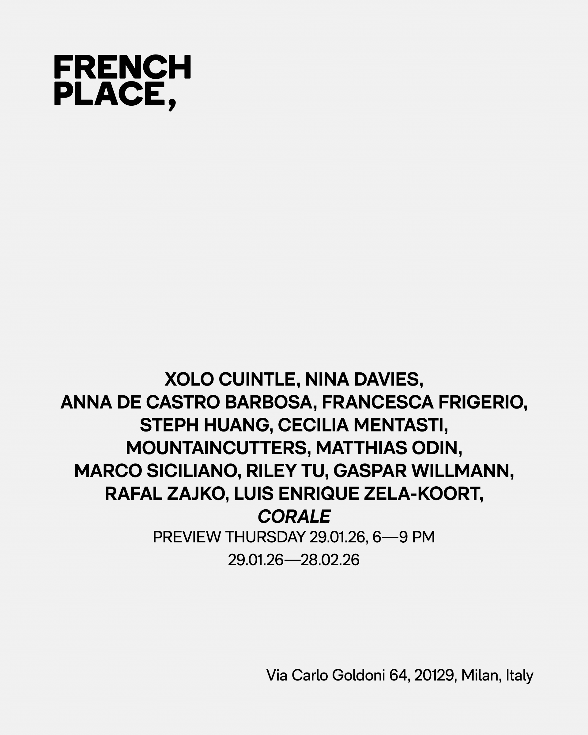 Da giovedì 29 gennaio a sabato 28 febbraio 2026, FRENCH PLACE è lieta di presentare la sua mostra inaugurale CORALE, con opere di Xolo Cuintle, Nina Davies, Anna De Castro Barbosa, Francesca Frigerio, Steph Huang, Cecilia Mentasti, Mountaincutters, Matthias Odin, Marco Siciliano, Riley Tu, Gaspar Willmann, Rafał Zajko, Luis Enrique Zela-Koort. La mostra segna l’apertura dello spazio a Milano e definisce la sua visione curatoriale, fondata su polifonia, relazione e forme condivise di collettività.