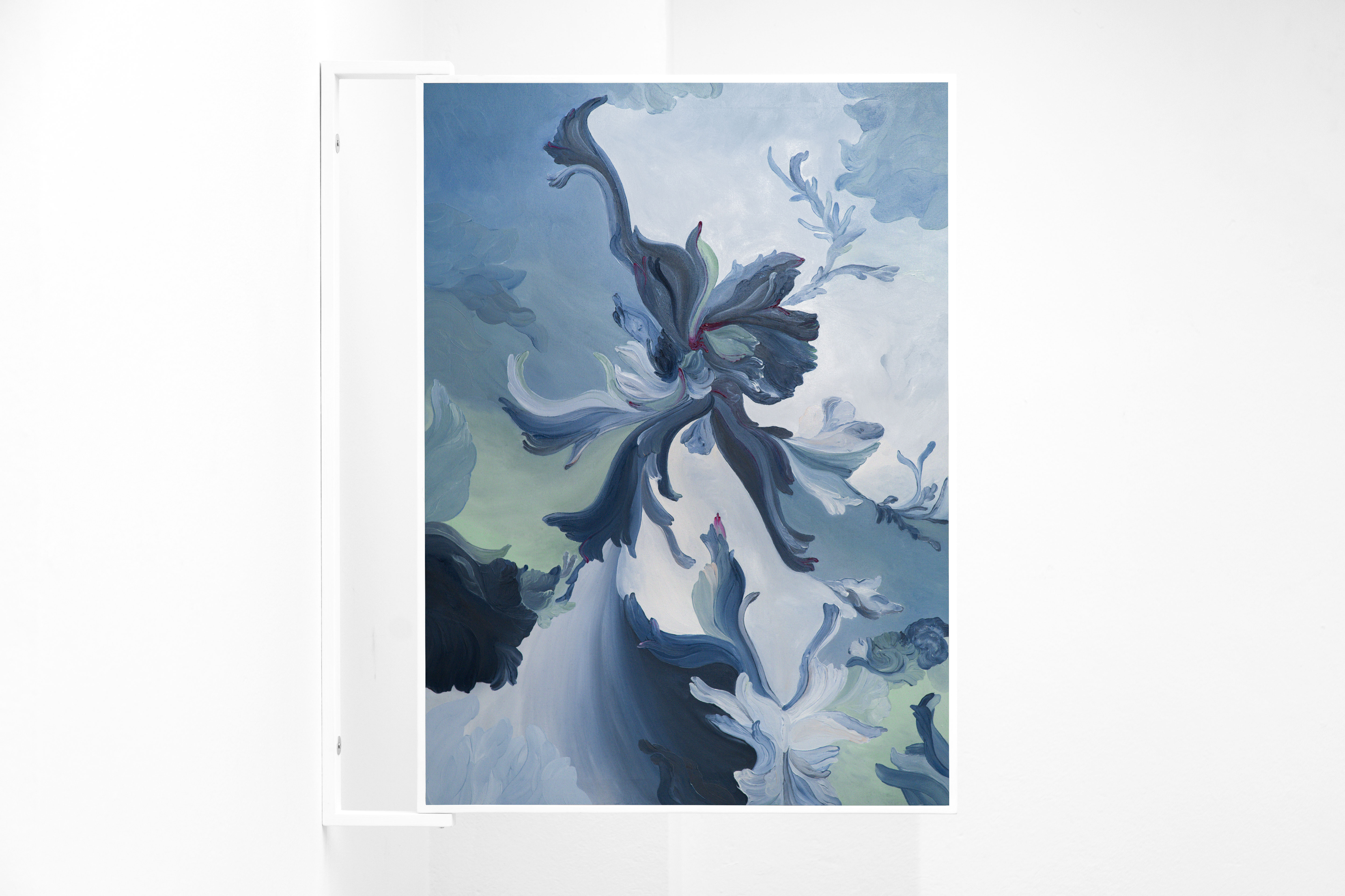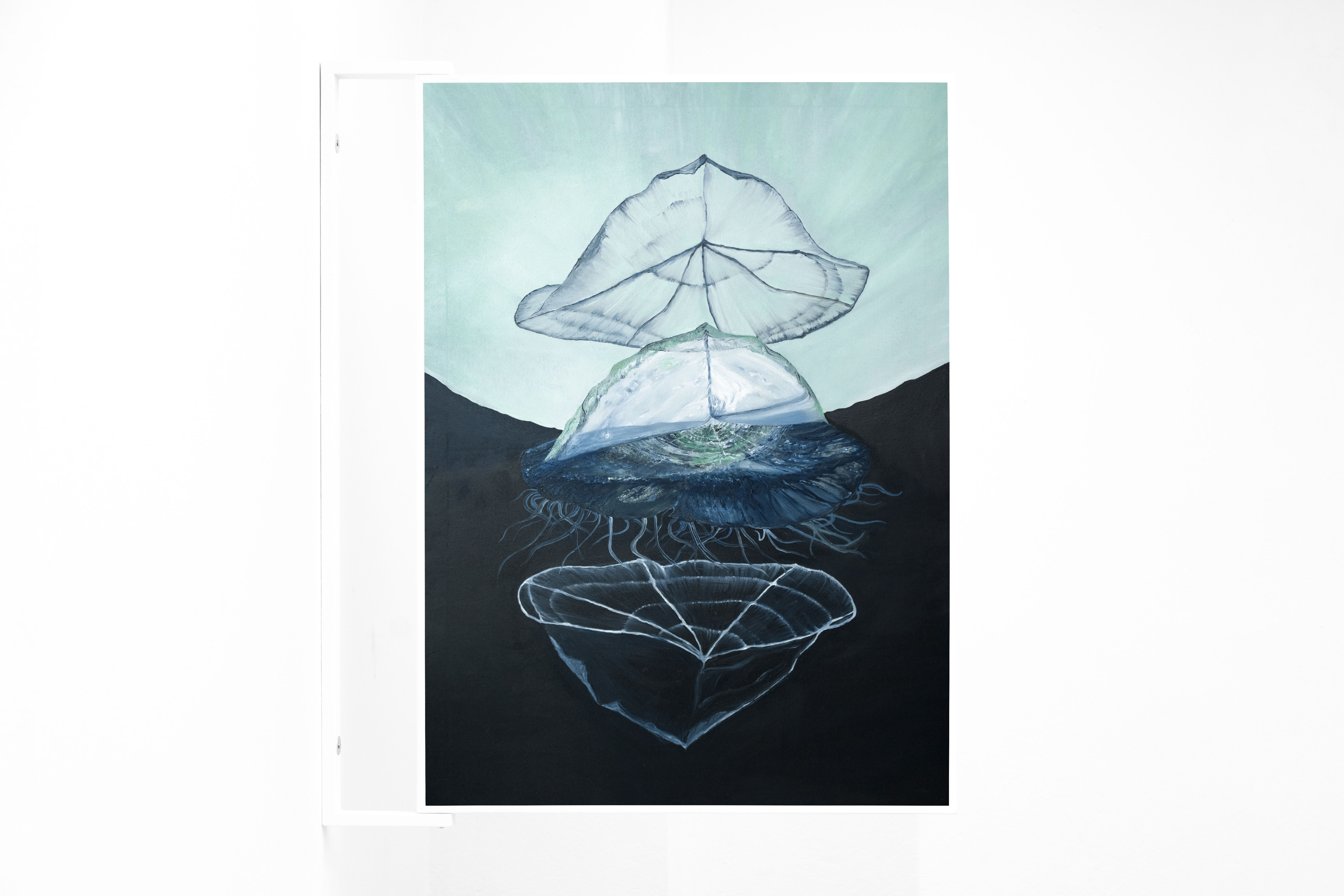 Le opere di La Marca offrono uno sguardo affascinante e profondo sulle origini della vita e sugli intrecci invisibili che uniscono gli esseri viventi in un continuo flusso di coesione, cambiamento e trasformazione. I suoi dipinti esplorano la simbiosi tra le forze naturali, raccontando storie ancestrali attraverso movimenti delicati, come quelli delle alghe marine e delle onde del mare, fino ad arrivare a rappresentare il movimento delle Velelle Velelle, spinte dal vento verso la Luna. In queste opere, Alessandra La Marca traccia un filo invisibile che connette ogni organismo, attraversando il tempo e lo spazio. Questo stesso filo, che lega la materia, richiama concetti cari alla scrittrice Ursula K. Le Guin e alla filosofa Donna Haraway. Le Guin, nel suo The Carrier Bag Theory of Fiction, ci invita a riflettere sul valore della connessione e della raccolta, contrapponendosi alla visione della storia come conquista o dominazione. Le sue visioni di mondi interconnessi riecheggiano nelle opere di La Marca, dove ogni dipinto diventa una metafora di incontri tra esseri viventi che si sostengono e si trasformano a vicenda. Allo stesso modo, nella figura della bambina-farfalla Camille, protagonista del testo Chthulucene di Donna Haraway, possiamo percepire una visione simile di co-creazione e metamorfosi: nei dipinti dell’artista, la struttura delle immagini si dissolve e si trasforma, creando spazi che oscillano tra il figurativo e l'astratto, tra il presente e il primordiale. Le tele, dipinte a olio su tela grezza, sono disposte in modo tale da essere visibili sia frontalmente che dal retro, grazie a cornici girevoli poste perpendicolari alla parete. Questa disposizione offre la possibilità di osservare la stessa immagine da diverse angolazioni, rivelando la mutazione delle forme e facendo svanire le frontiere tra individuo e collettivo, tra figura e sfondo.