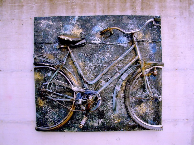 A cominciare da ERIKA CALESINI, la cui presenza è legata alla preziosa collaborazione con l’Associazione Culturale Ferrara Pro Art che ringraziamo calorosamente. Erika Calesini utilizzando materiali di recupero crea delle pittosculture dove le biciclette formano un unico organismo che si nutre della tela e del colore, attraversando lo spazio pittorico e rendendolo “reale”.