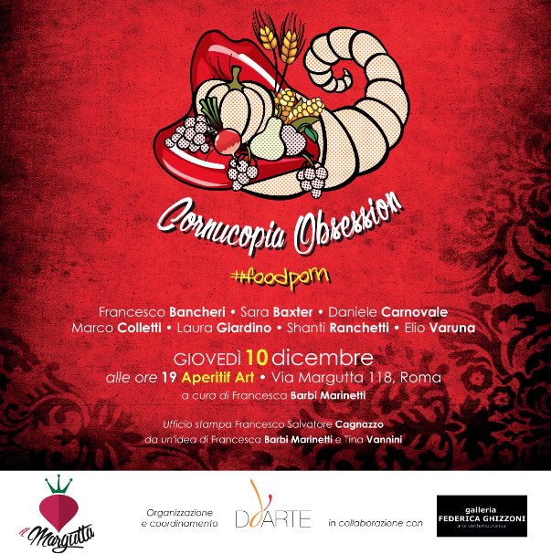 LA MOSTRA - È attorno a questi temi che si esprimono gli artisti in Cornucopia Obsession #foodporn, mostra che si inaugura giovedì 10 dicembre dalle ore 19 presso il rinnovato spazio espositivo dello storico vegetariano di Roma. La mostra, curata da Francesca Barbi Marinetti e in collaborazione con la Galleria Federica Ghizzoni, nasce da un’idea di Francesca Barbi Marinetti e Tina Vannini. Le opere sono di Francesco Bancheri, Sara Baxter, Daniele Carnovale, Marco Colletti, Laura Giardino, Shanti Ranchetti ed Elio Varuna. La mostra sarà visitabile gratuitamente sino al 10 febbraio.