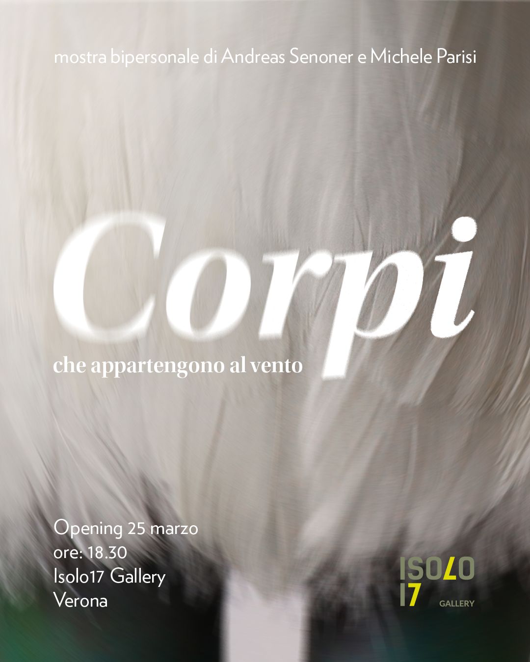 Corpi che appartengono al vento, è una mostra bipersonale di Michele Parisi e Andreas Senoner che per la prima volta verranno ospitati assieme negli spazi di Isolo 17 Gallery. Parisi presenterà una nuova serie di grandi tele, evocatrice di silenzi e ricordi,