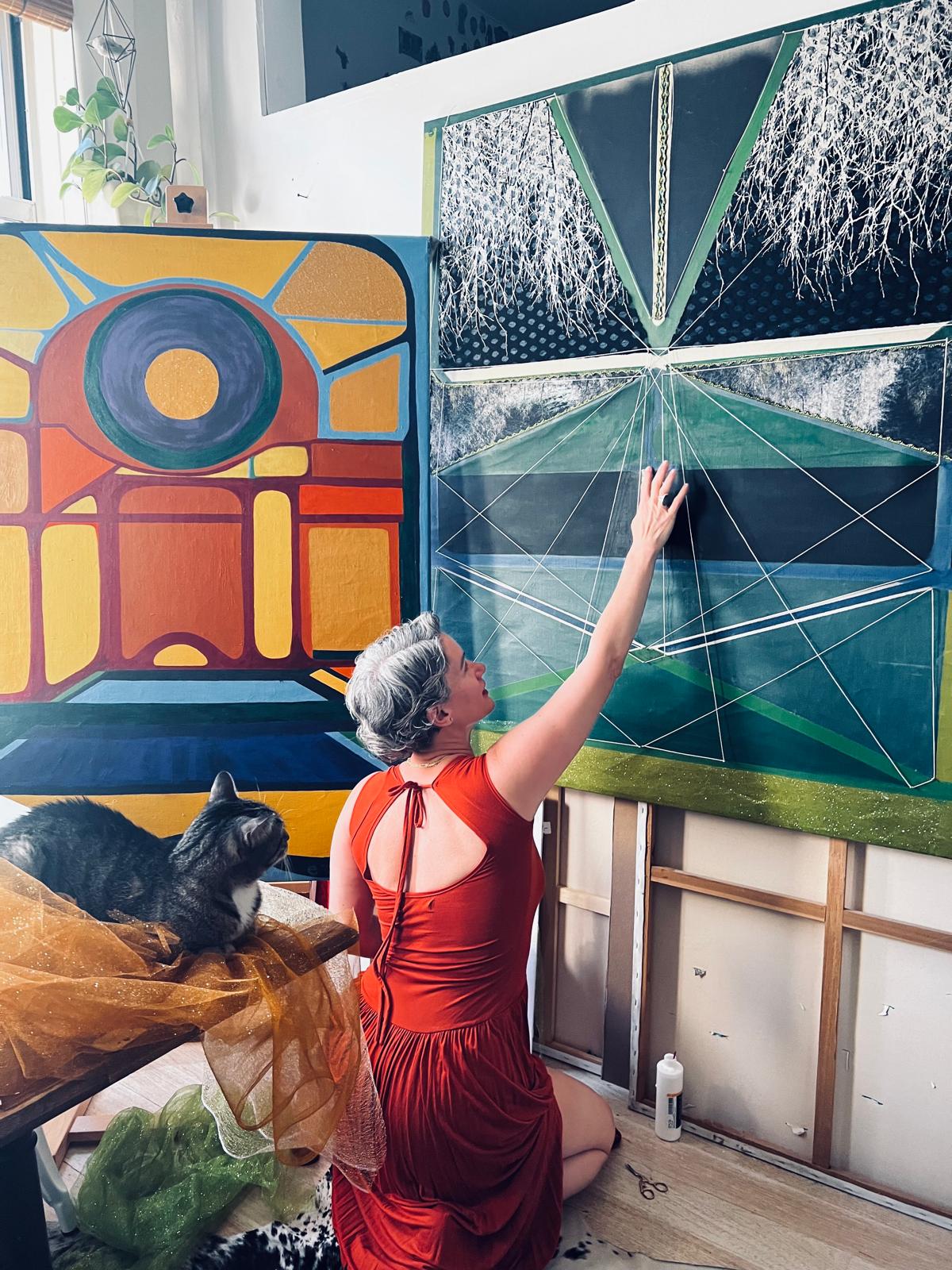 La prima volta che abbiamo incontrato le opere di India Evans è stato a New York, nello spazio domestico in cui prendono vita — racconta Giorgia Alderuccio, curatrice della mostra — Nello stesso ambiente compaiono anche i collage del padre, John Evans. Il collage si rivela così come una lingua familiare, un gesto ereditato ma radicalmente riformulato. Se nel lavoro del padre il frammento diventa strumento per raccontare una comunità e un tempo storico, in quello di India il collage si fa dispositivo di interrogazione del femminile.