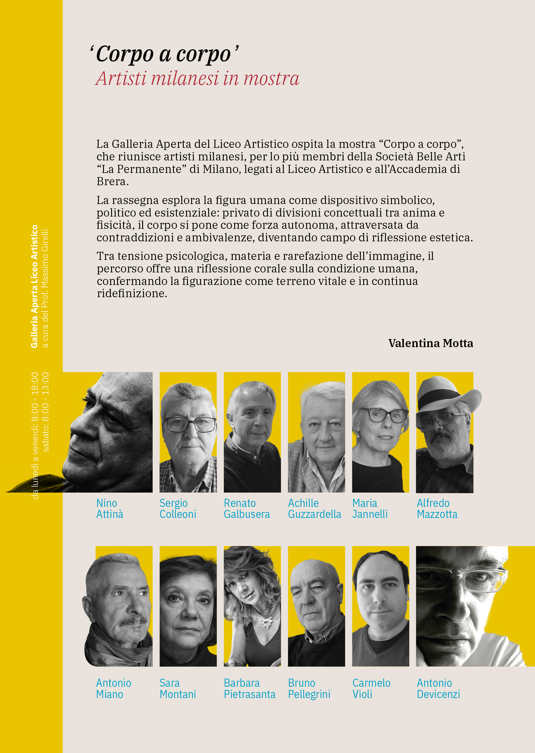 La Galleria Aperta Liceo Artistico ospita “Corpo a corpo”, mostra di artisti milanesi, che esplora la figura umana attraverso pittura e figurazione, indagando corpo, materia, tensione estetica e identità contemporanea. Espongono 12 artisti, membri della Società Belle Arti “La Permanente” di Milano.
