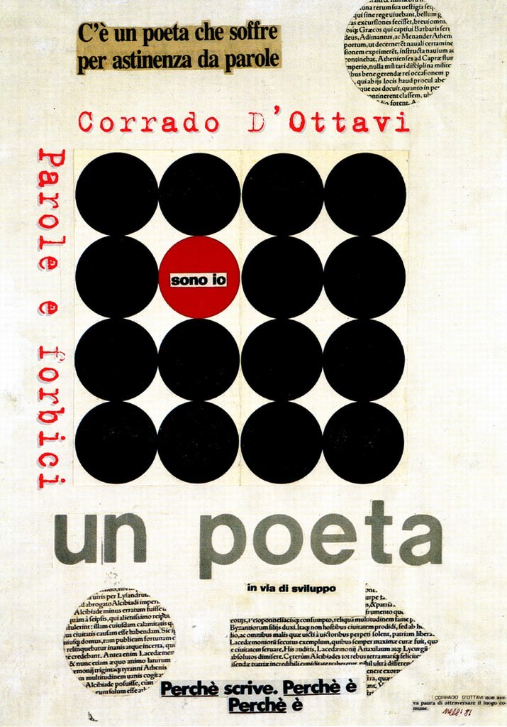 L’Editrice Aracne inaugura la Collana con il I volume dedicato a Corrado D’Ottavi (1934/1984), e trascorso mezzo secolo da quando il nostro pubblicava la prima poesia visiva italiana sul terzo numero di Ana Eccetera, rivista nata in una Genova piena di avanguardie poetiche. I lavori di D’Ottavi si possono differenziare in due tappe, quelli precedenti al ’58-’60, e quelli del periodo successivo. Nel primo periodo l’artista pratica inizialmente una scrittura a mano con inserti di ascendenza informale prossimi a esercizi anticalligrafici, trapassando a una sperimentazione collagistica in cui lacerti colorati si assemblano frammenti verticali. Negli anni successivi si manifesta invece un’adesione via via più marcata ai moduli del linguaggio pubblicitario, mentre nel messaggio verbale la connotazione poetico-sperimentale viene sostituita da una valenza comunicativa immediata.