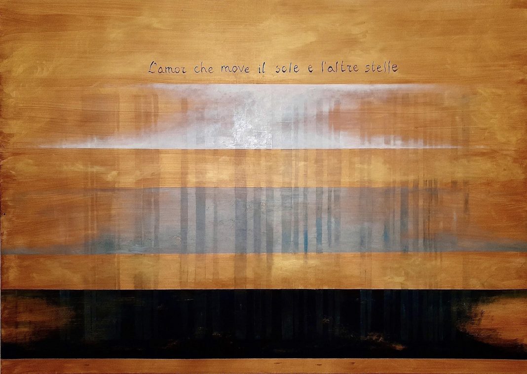 Veneziano, indugiando anche sul figurativo, rilegge le tre Cantiche di Dante attraverso i codici algoritmici degli ISBN letterari disponendo trentatré (o trentaquattro, per l'Inferno) linee tra loro parallele che si fanno di volta in volta graffi, tende, colonne, e poi righe, tratti e segni elegantissimi su cui in alto campeggiano le parole di Dante e delle sue terzine. In altre tele, l’artista valorizza invece un altro codice, l’alfabeto Morse, fatto di linee e punti, già presenti nella ricerca pittorica a partire da Kandinskji, e carichi di implicazioni ritmiche, orali e musicali. In altri quadri, infine, la mostra restituisce suggestioni e parole di grandi autori del Novecento (Eliot, Pound, Borges) orgogliosamente e dichiaratamente debitori della poetica dantesca.