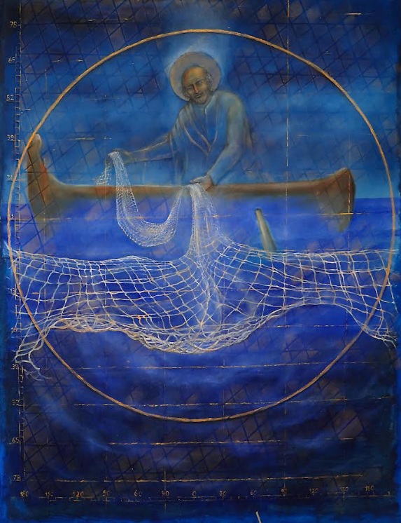 Il quadro si sviluppa su uno sfondo dominato dall’azzurro, in cui mare e cielo si confondono. Al centro, San Pietro è rappresentato come un marinaio che getta le reti – la rete dell’umanità, la rete della fede – mentre i suoi gesti si proiettano tra trame invisibili e coordinate geografiche: paralleli e meridiani che simboleggiano un mondo fragile ma ancora navigabile, unito da un compito di salvezza.