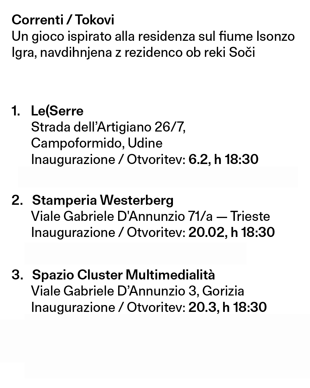 Durante la residenza artistica Correnti (settembre 2025), il gioco è stato strumento di esplorazione dell’area del fiume Isonzo tra Kanal e Gradisca, tra Slovenia e Italia.